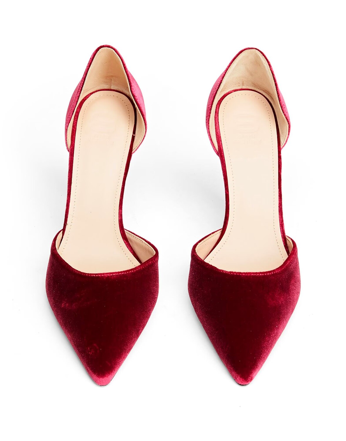 Сделанные в Италии, эти остроконечные бархатные туфли d'Orsay придают элегантность и женственность благодаря узкому обтянутому каблуку-калупе в тон и открытому силуэту по бокам. Модель выполнена из кожи и имеет резиновую подошву.