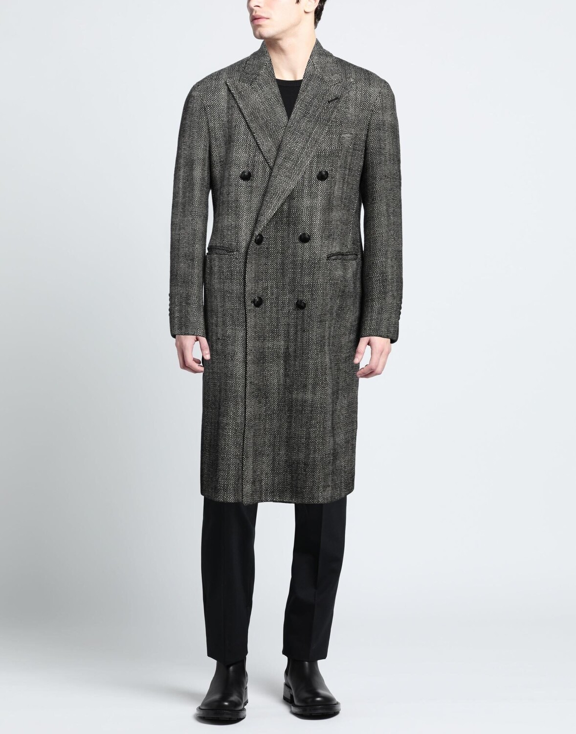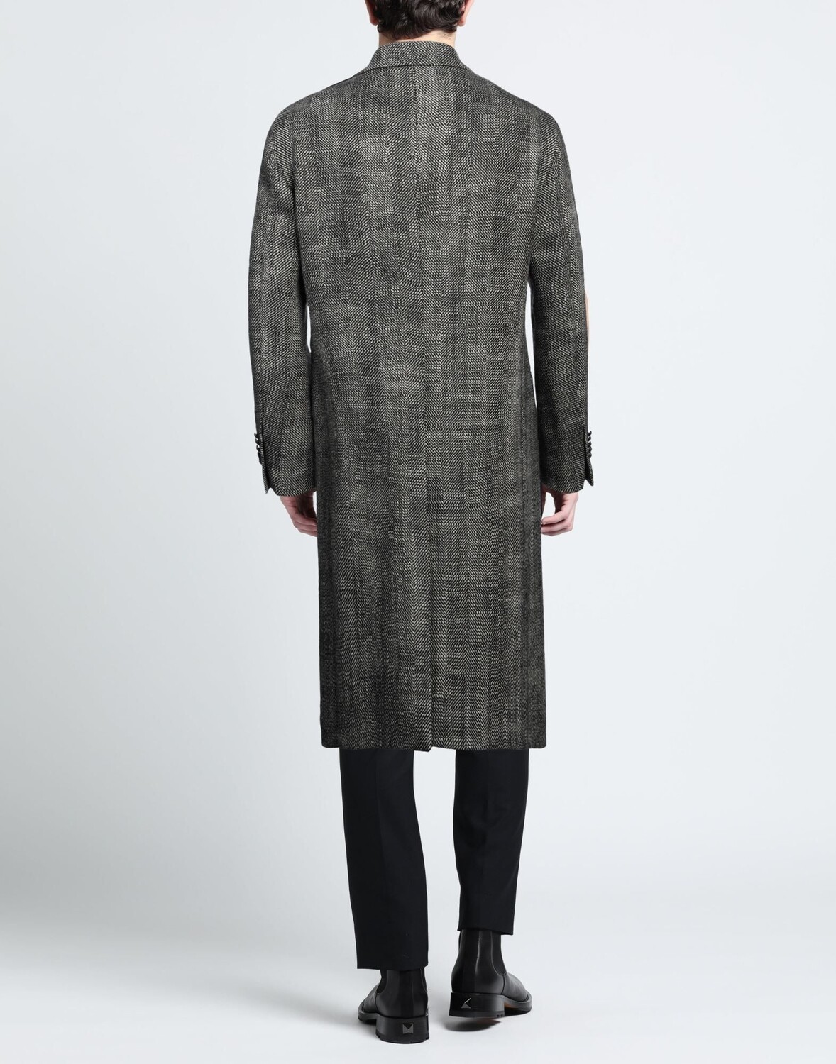 Фланель, открытая спина, двухцветное изображение, воротник с лацканами, длинные рукава, внутри на подкладке, застежка на пуговицы, множество карманов, химчистка, нельзя отбеливать, нельзя сушить в стиральной машине, двубортное пальто