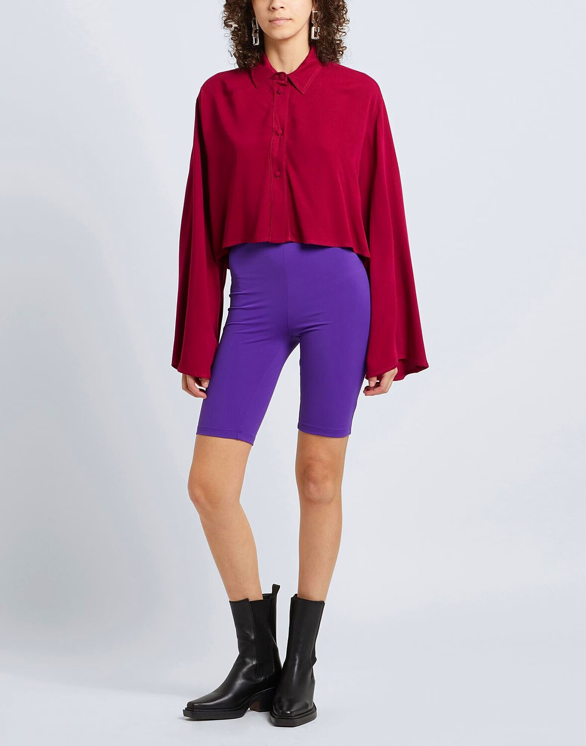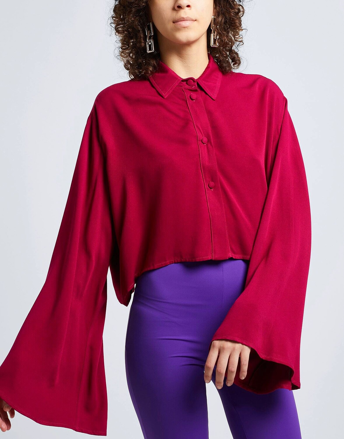 Эта рубашка изготовлена ​​в Италии, имеет характерный короткий крой и рукава-колокольчики. Модель выполнена из однотонного вискозного твила, имеет классический воротник и застежку на пуговицы спереди. На модели итальянский размер S/40.
