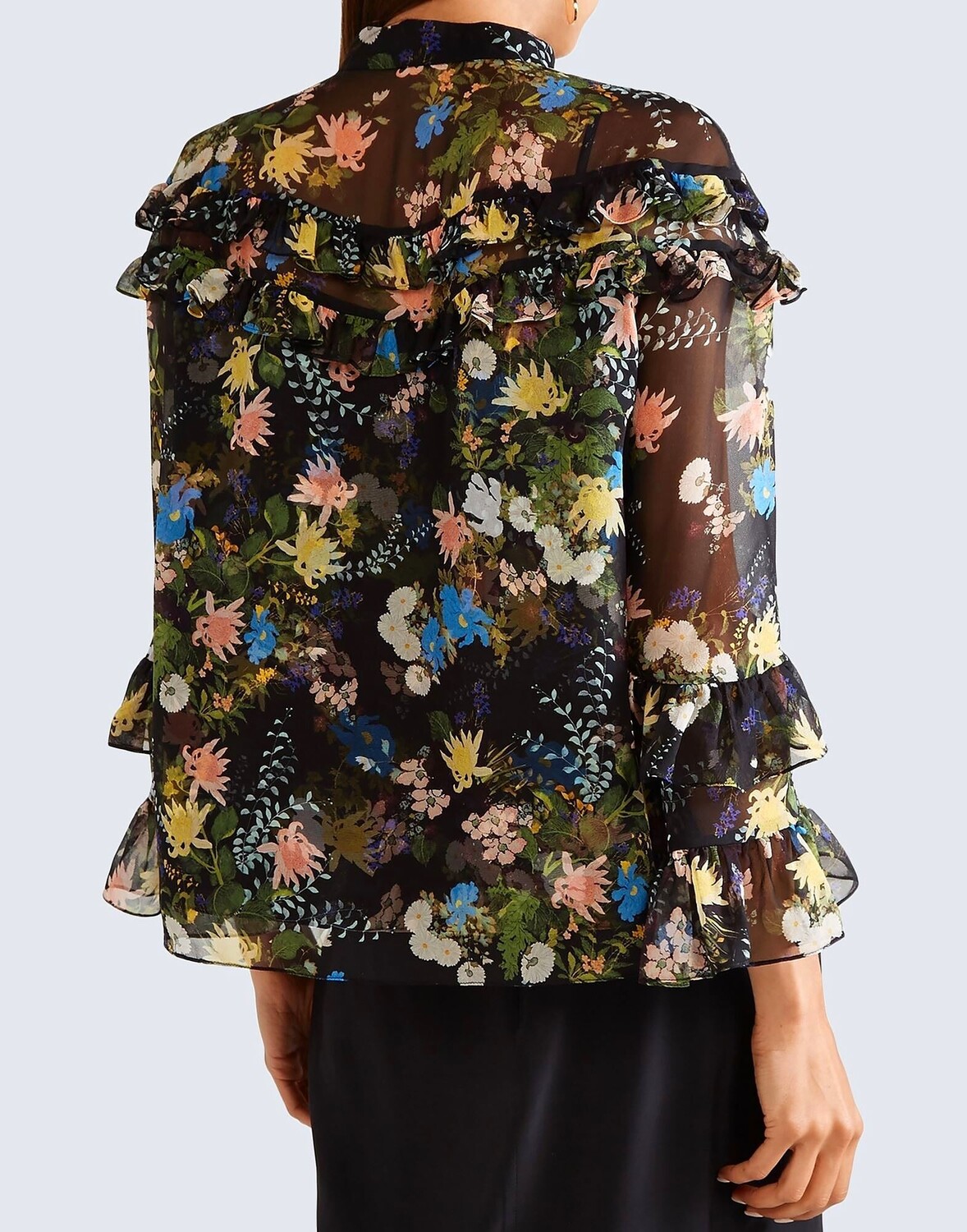 Шифон, Цветочный дизайн, Рукава 3/4, Оборки, Оборки, V-образный вырез