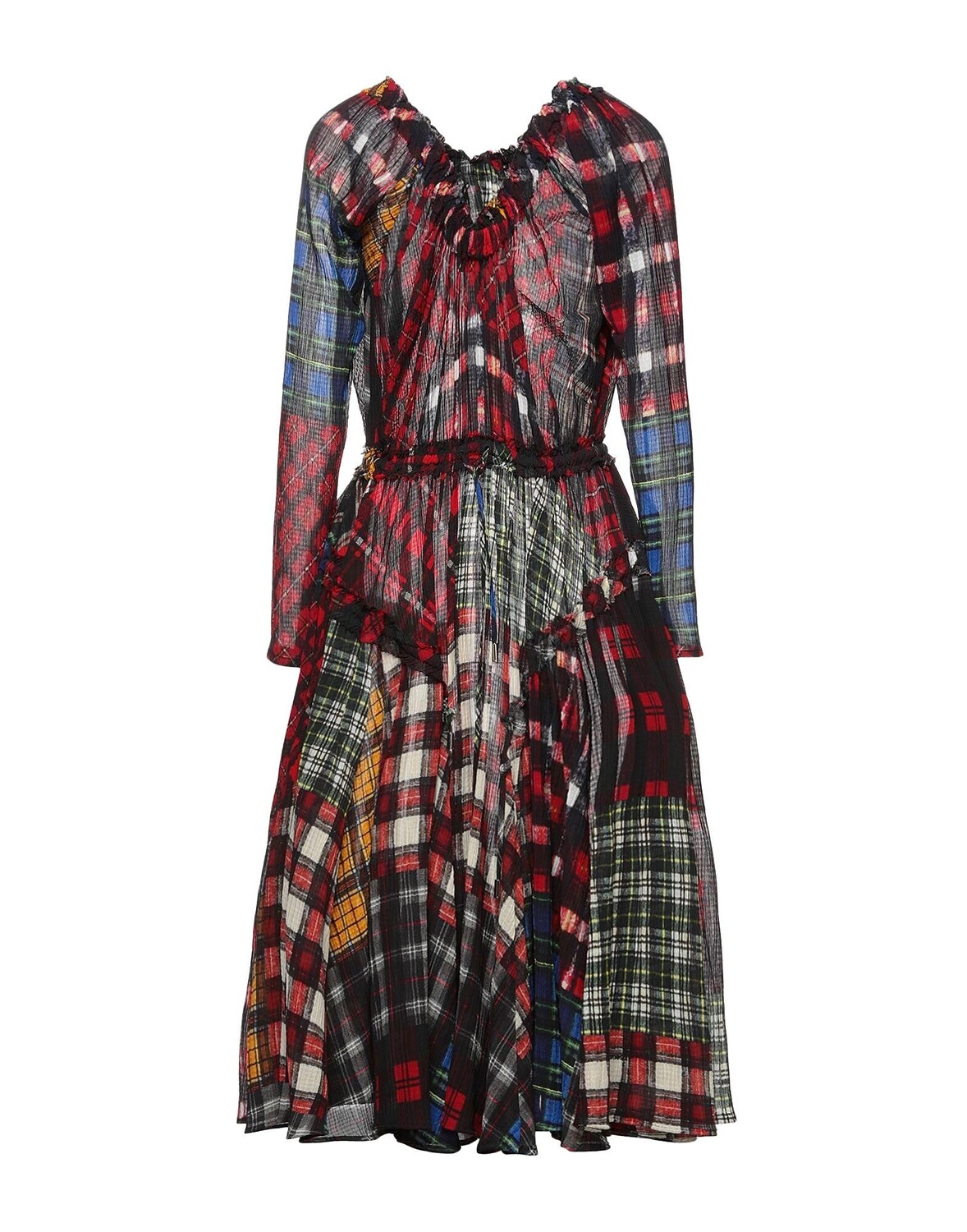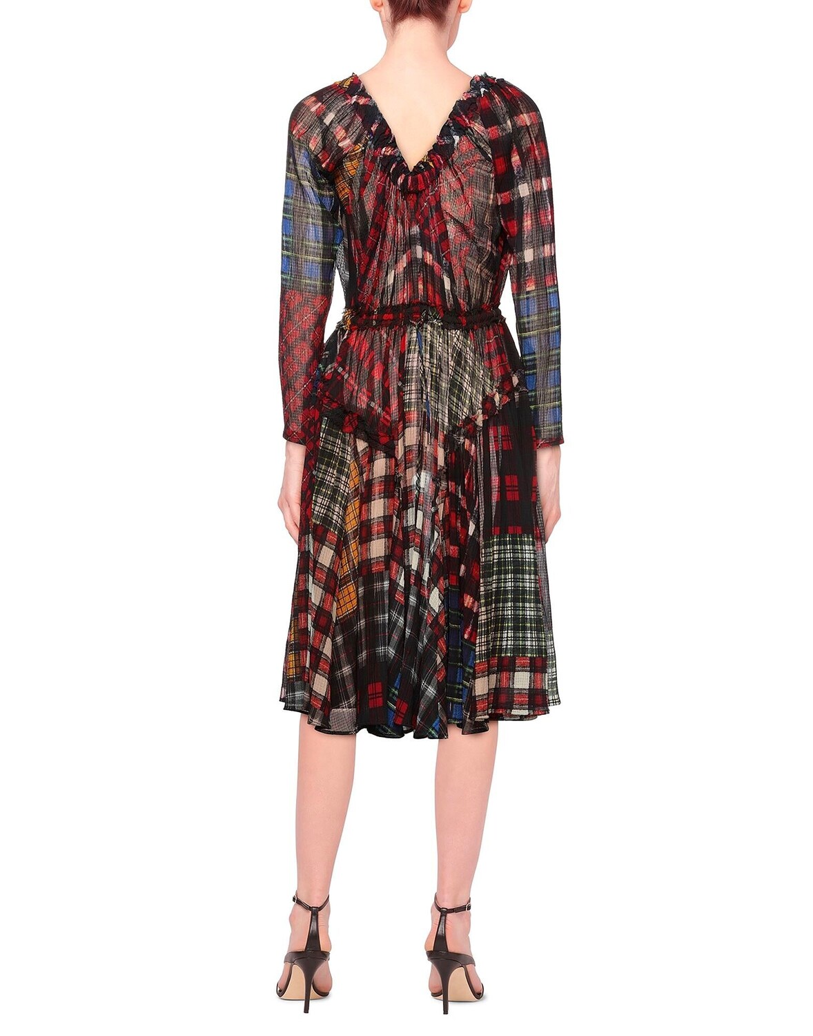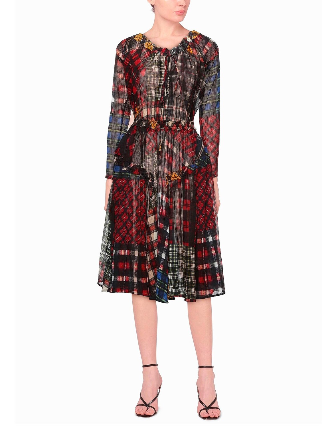 Расклешенное платье, креп, узор «тартан», без аппликаций, овальный вырез, длинные рукава, без подкладки, застежка на кулиске, без карманов, малый тираж этой марки