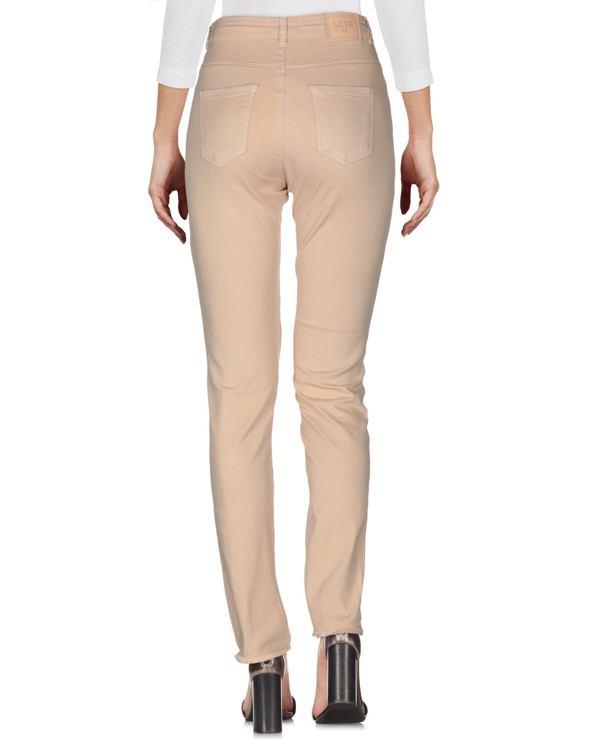 Ткань, кожаная отделка, логотип бренда, одноцветное изделие, средняя посадка, зауженные брючины, узкие брюки, застежка-молния, 1 пуговица, необработанный низ, множество карманов, эластичный, машинная стирка, нельзя сушить в стиральной машине, не отбеливать, содержит нетекстильные части животного происхождения, 5 карманов