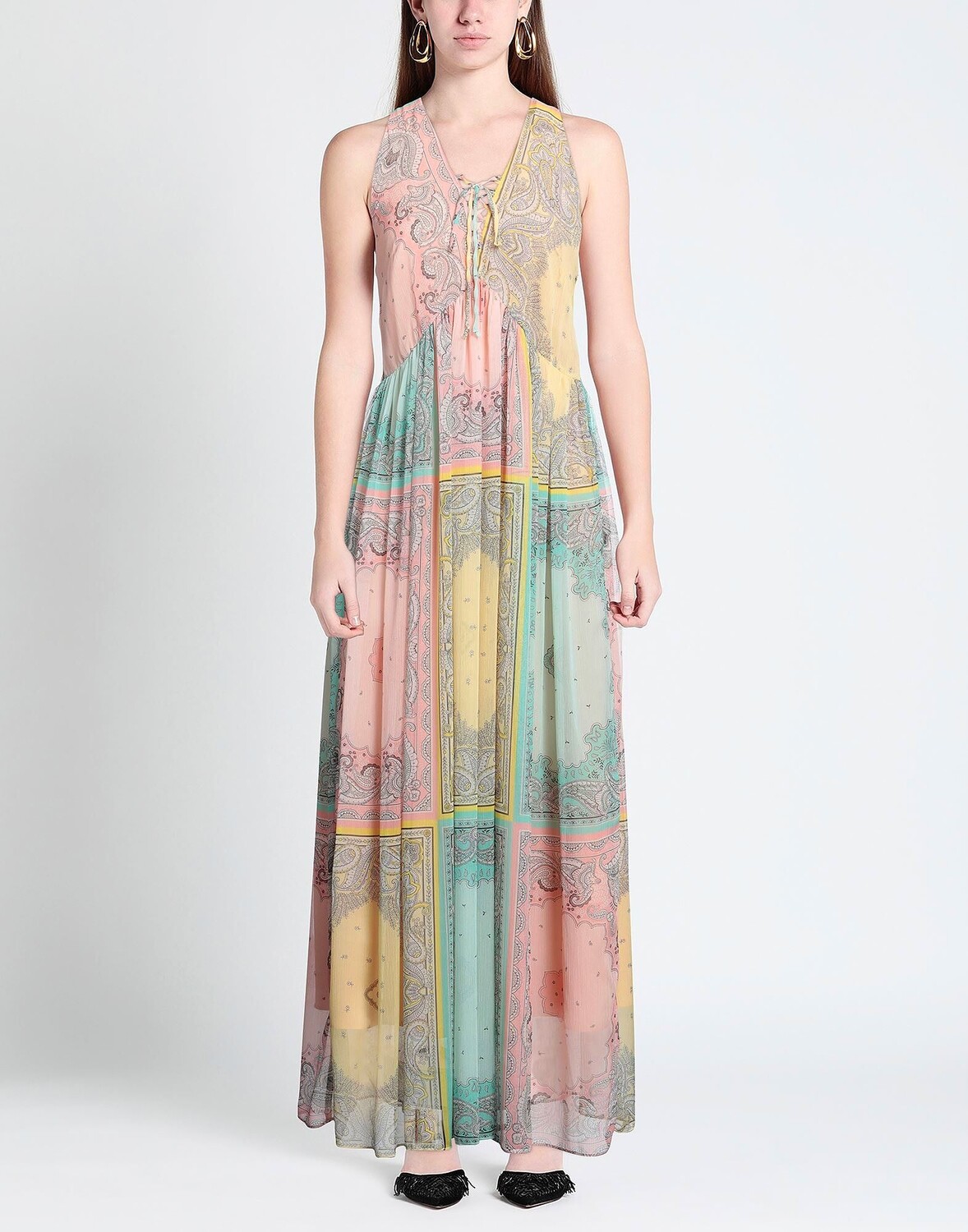 Креп, логотип бренда, шнуровка, принт пейсли, v-образный вырез, без рукавов, на подкладке, пуговицы, без карманов, фасон трапеция