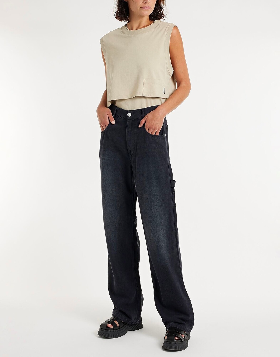 Джинсовая ткань, без аппликаций, одноцветное изделие, цветная стирка, завышенная талия, свободный крой, застежка-молния, множество карманов, машинная стирка, нельзя сушить в машине, мешковатые джинсы