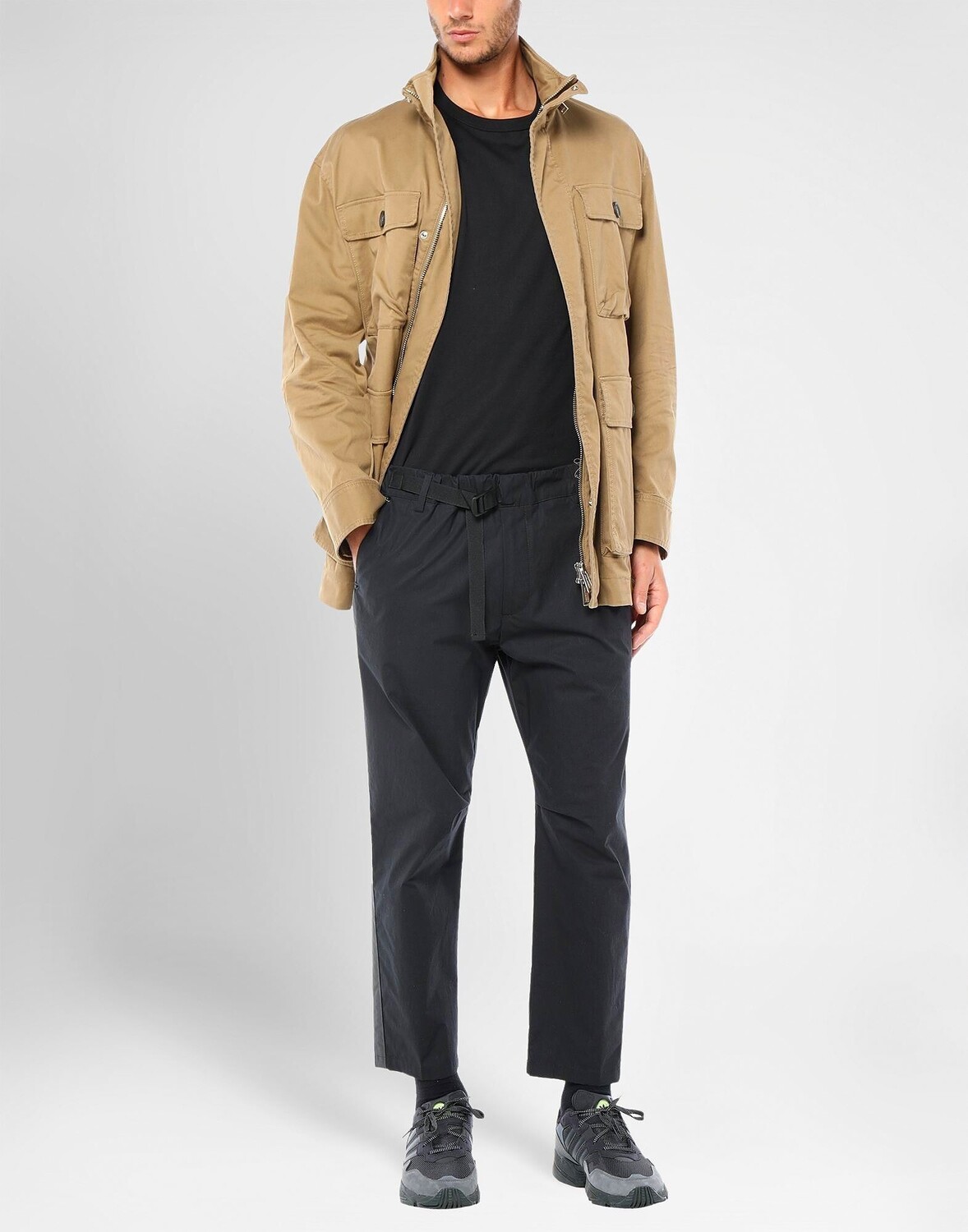 Габардин, логотип, одноцветное изделие, однобортный, кнопки, молния, воротник-стойка, множество карманов, длинные рукава, без подкладки, содержит нетекстильные части животного происхождения, стрейч