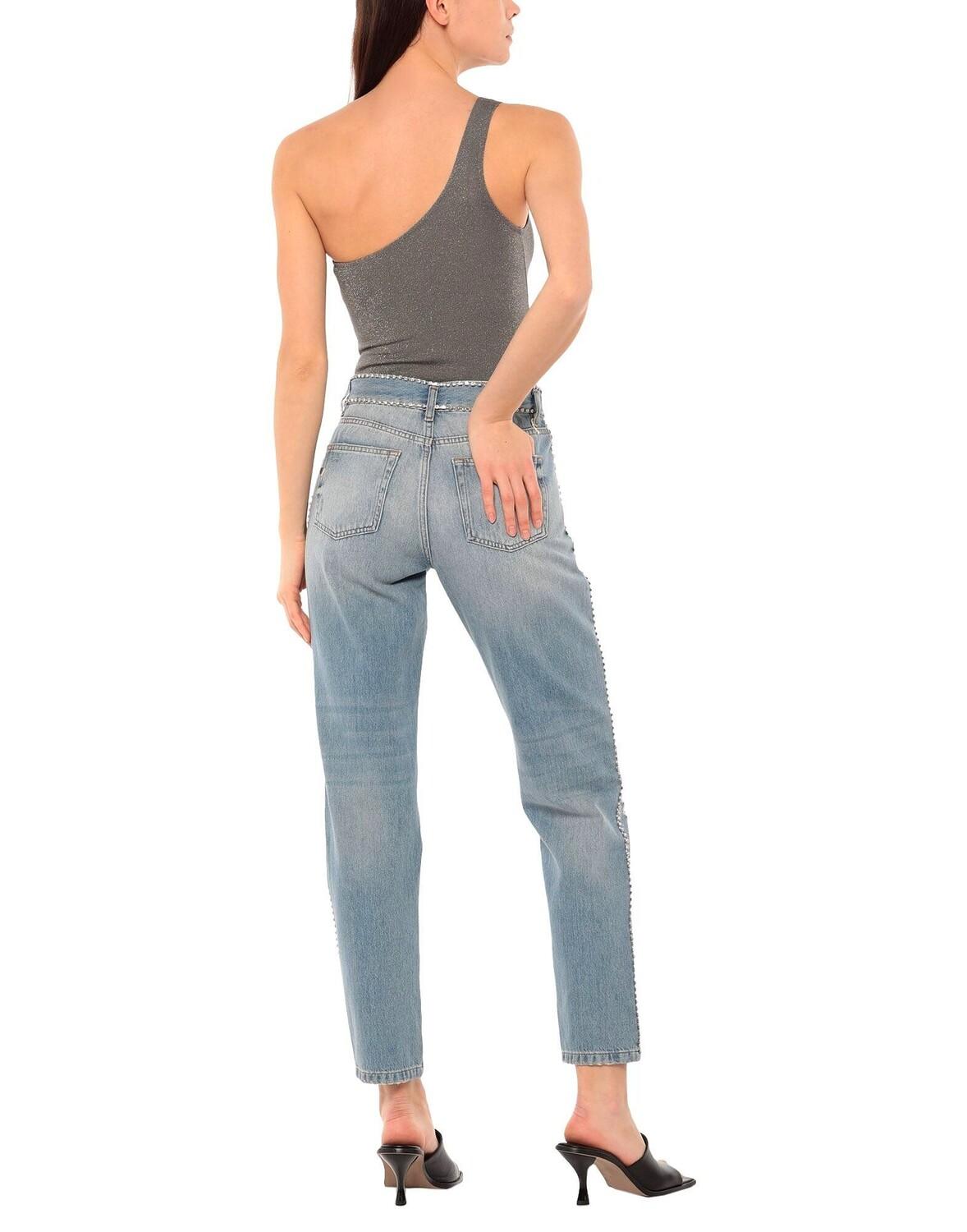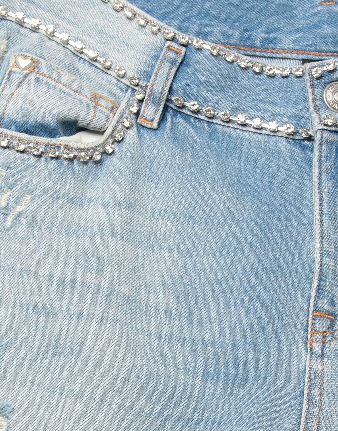 Деним, выцветший, логотип, стразы, рваная ткань, средняя стирка, завышенная талия, застежка спереди, пуговица, молния, множество карманов, одноцветное изделие