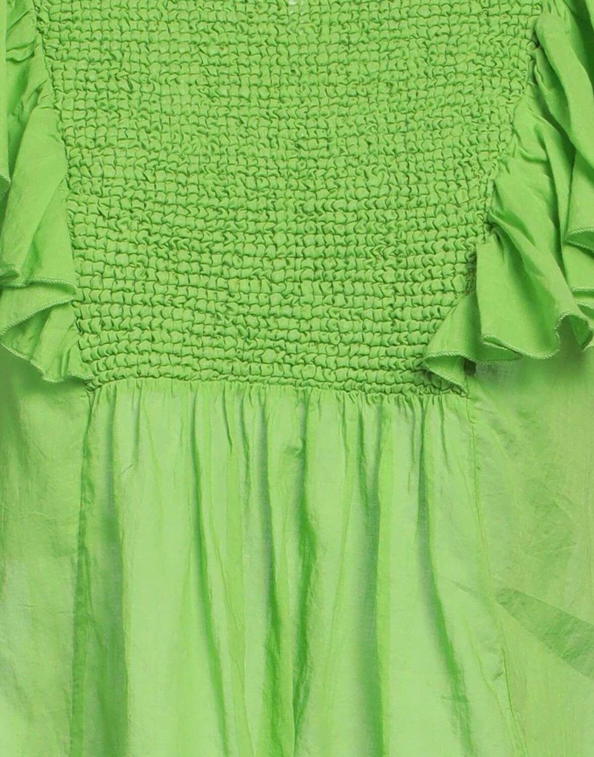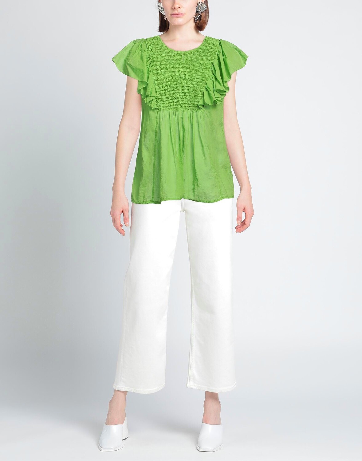 Топ со сборками, ткань, оборки, одноцветное изделие, круглый вырез, короткие рукава, 1 пуговица, без карманов