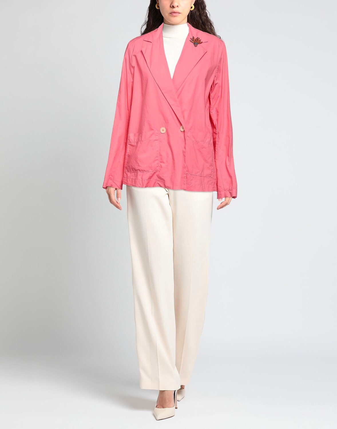 Полотняное переплетение, брошь, однотонное изделие с аппликациями, воротник с лацканами, двубортный, длинные рукава, внутренняя часть на частичной подкладке, пуговицы, множество карманов, двубортный пиджак