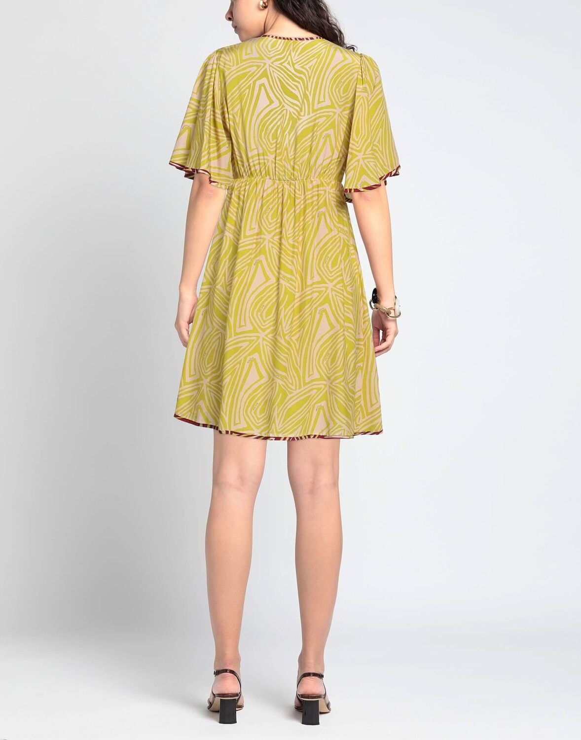 Полотняное переплетение, логотип бренда, многоцветный узор, дизайн логотипа, глубокий вырез, короткие рукава, рукава-клеш, без подкладки, без карманов, платье