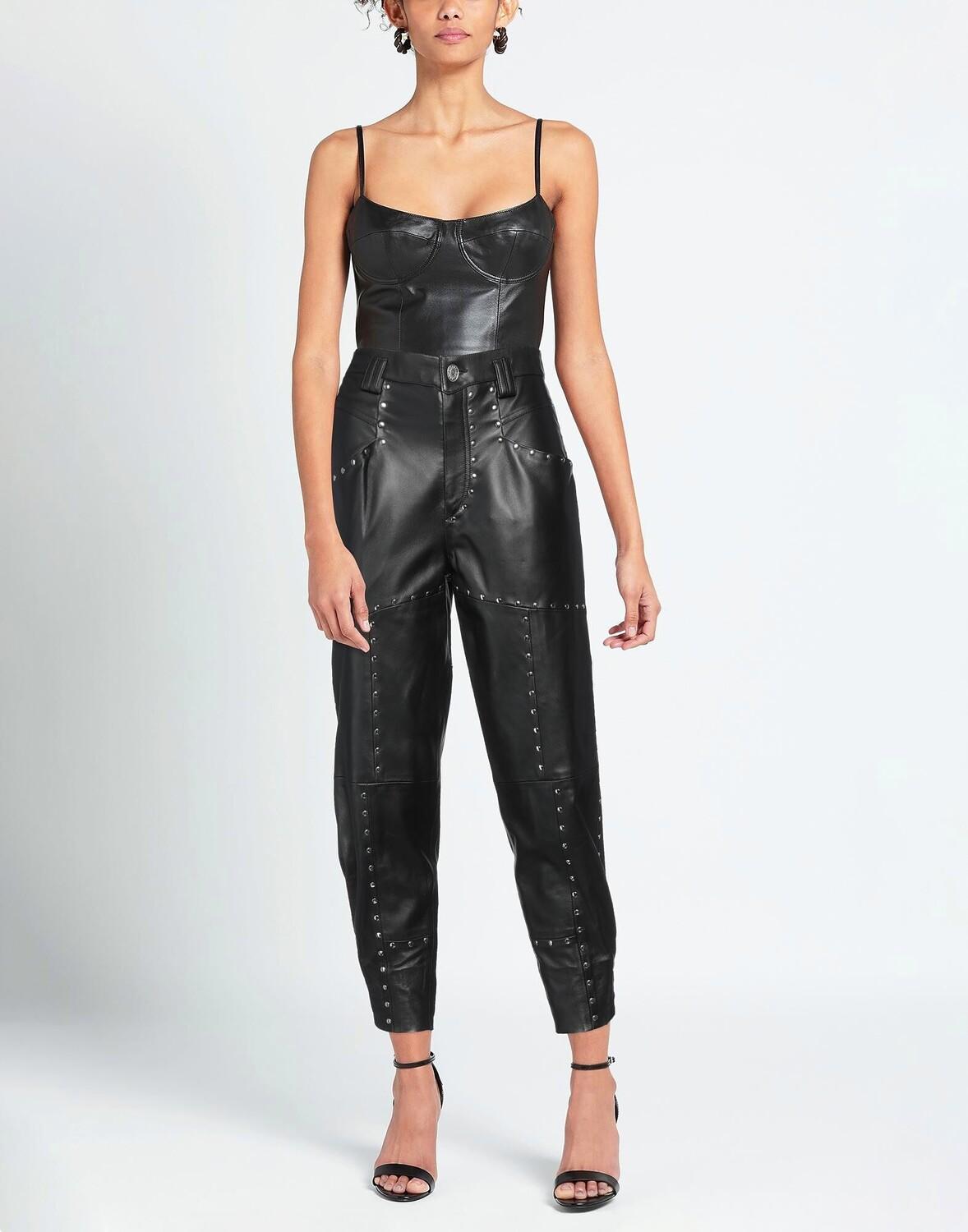 Кожа, металлические аппликации, логотип бренда, одноцветное изделие с аппликациями, завышенная талия, шлевки для ремня, зауженная брючина, стандартный крой, 1 пуговица, застежка-молния, множество карманов, содержит нетекстильные части животного происхождения, брюки