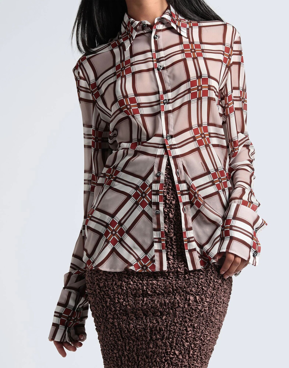 Креп, логотип бренда, клетка, разноцветный узор, классический вырез горловины, длинные рукава, манжеты на пуговицах, без подкладки, пуговицы, без карманов