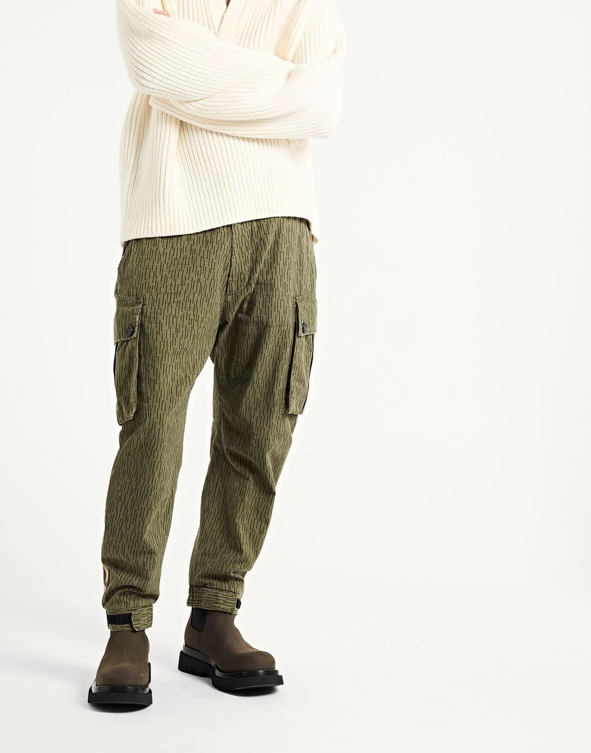 Ткань, репсовая ткань, логотип бренда, полосы по боковым швам, двухцветный вариант, завышенная талия, прямые брючины, стандартный крой, застежка на пуговицах, застежка-молния, множество карманов, машинная стирка, нельзя сушить в машине, не отбеливать, карго
