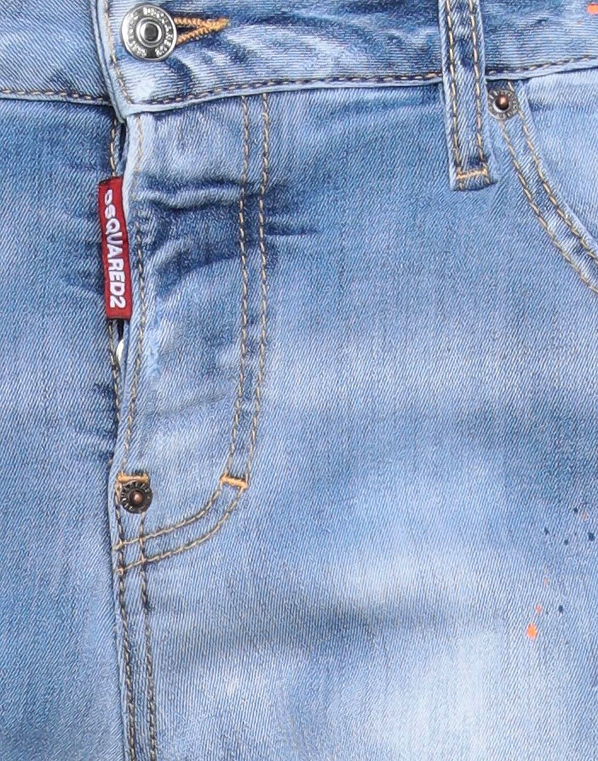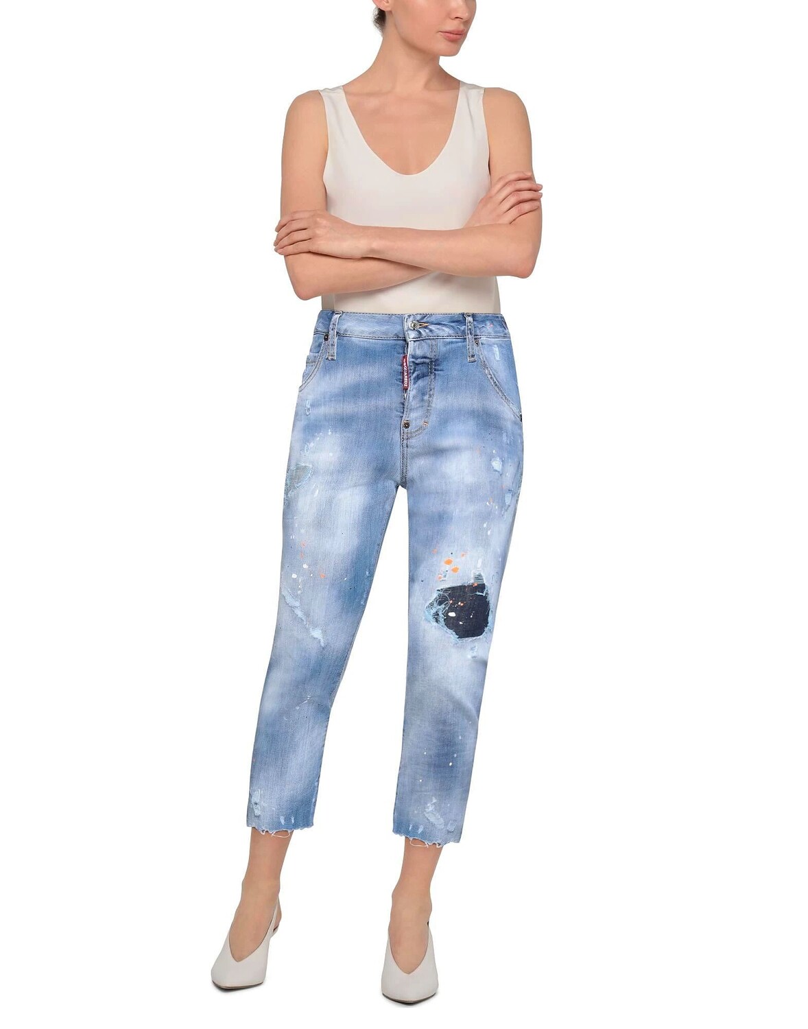Деним, эффект пятен, выцветший, кожаные аппликации, логотип, одноцветное изделие, светлая стирка, завышенная талия, застежка спереди, пуговицы, множество карманов, стрейч, содержит нетекстильные части животного происхождения