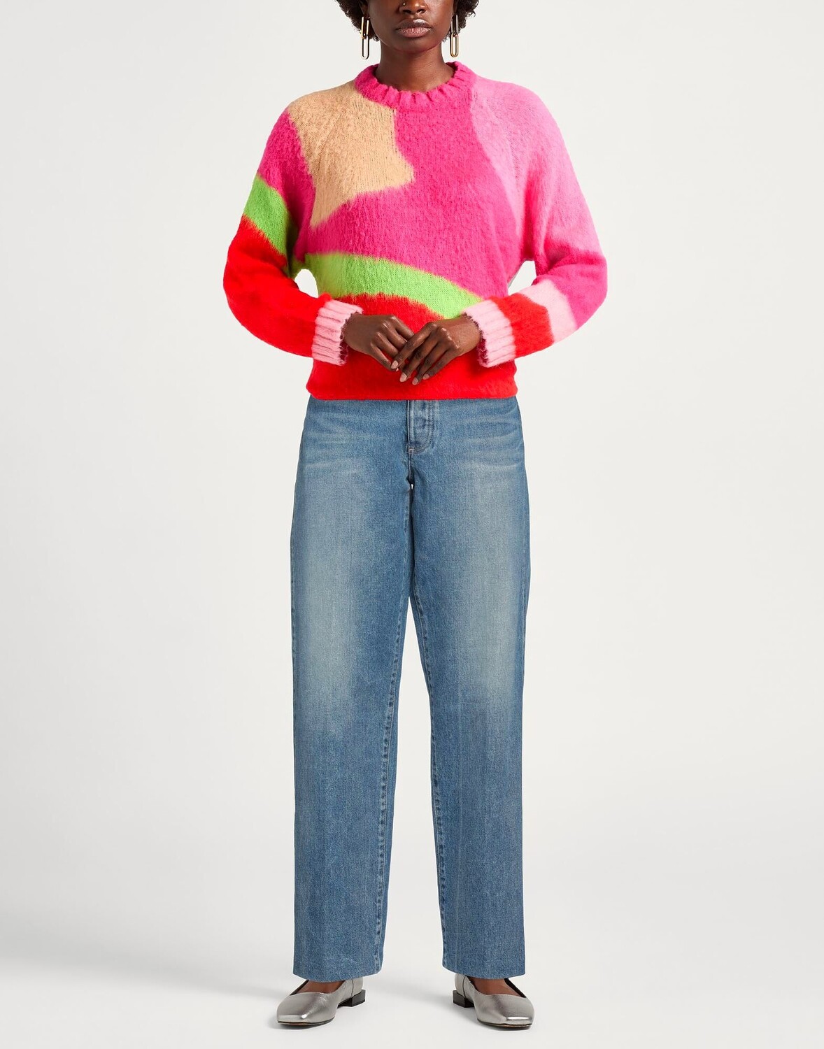Прямые джинсы, деним, потертые, потертые, одноцветное изделие, логотип бренда, темная стирка, завышенная талия, шлевки для ремня, стандартный крой, 1 пуговица, потайные пуговицы, множество карманов, машинная стирка, нельзя отбеливать, нельзя сушить в стиральной машине