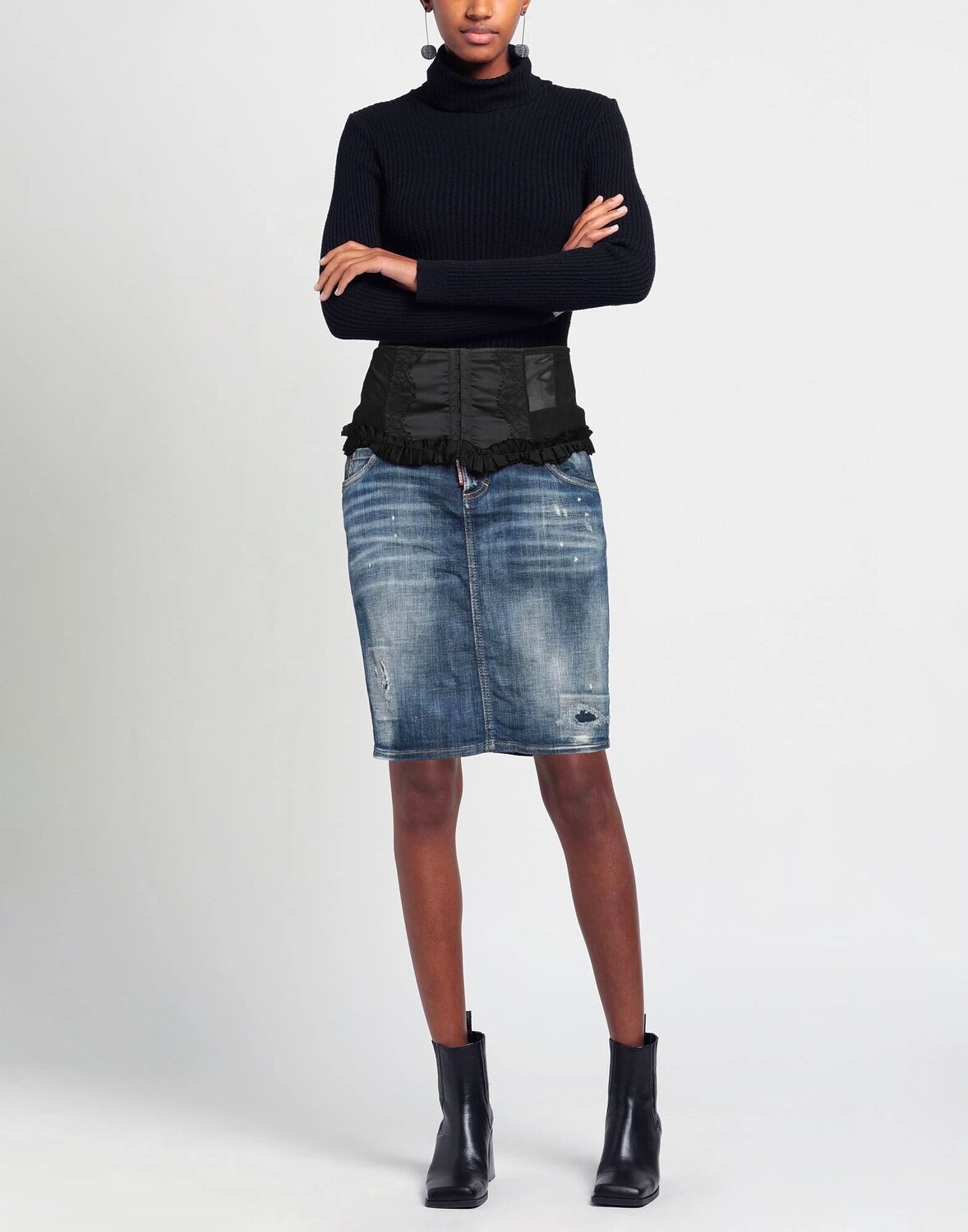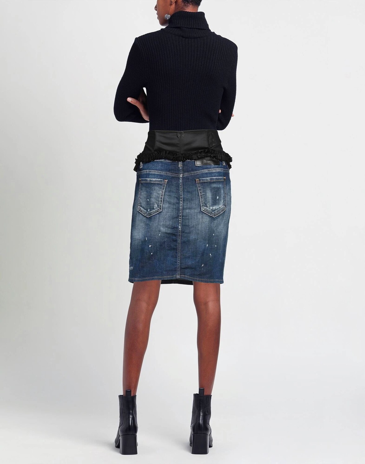 Джинсовая ткань, кружево, логотип бренда, одноцветное изделие, темная стирка, без подкладки, застежки на пуговицы, застежки на крючки, множество карманов, стрейч, ручная стирка, не отбеливать, нельзя сушить в стиральной машине, юбка-карандаш
