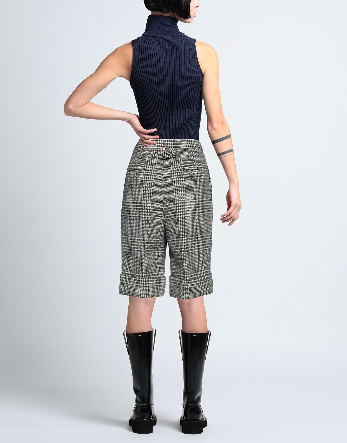 Фланель, вытачки, клетчатая клетка, высокая талия, стандартный крой, застежка-молния, застежка на крючки, подвернутый низ, множество карманов, химчистка, нельзя отбеливать, нельзя сушить в стиральной машине, шорты-бермуды