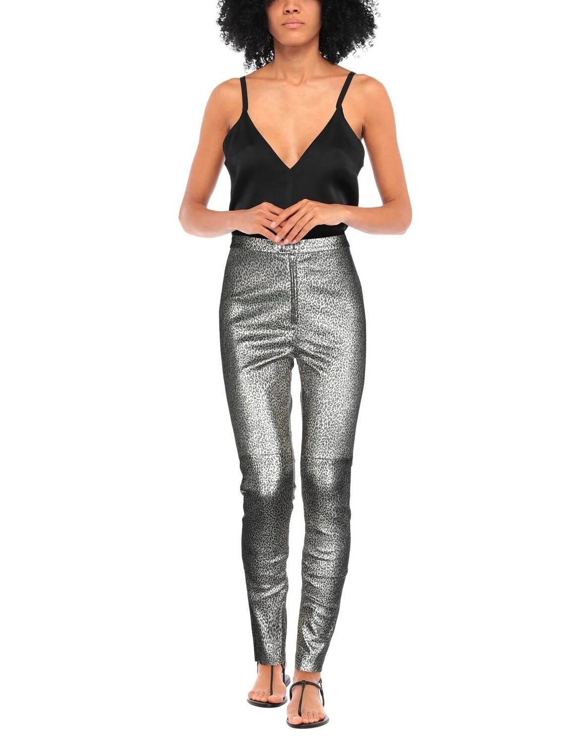 Кожа, металлик, без аппликаций, леопардовый принт, завышенная талия, стандартный крой, без карманов, содержит нетекстильные части животного происхождения, узкие брюки