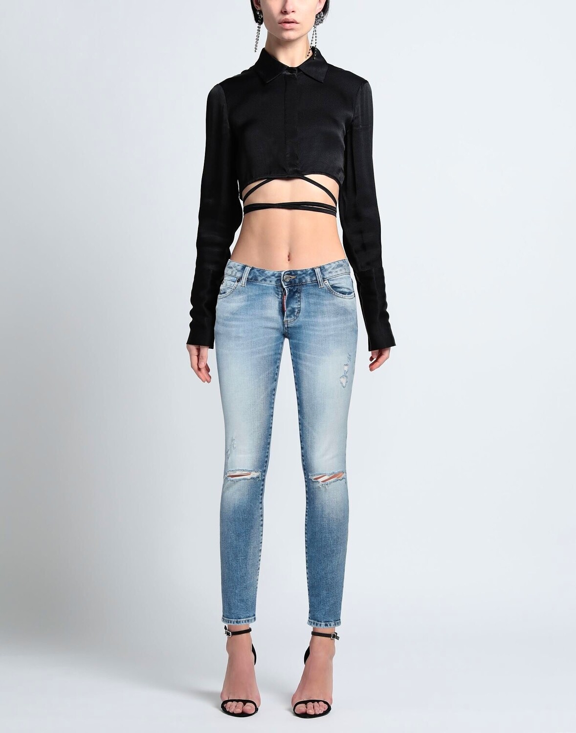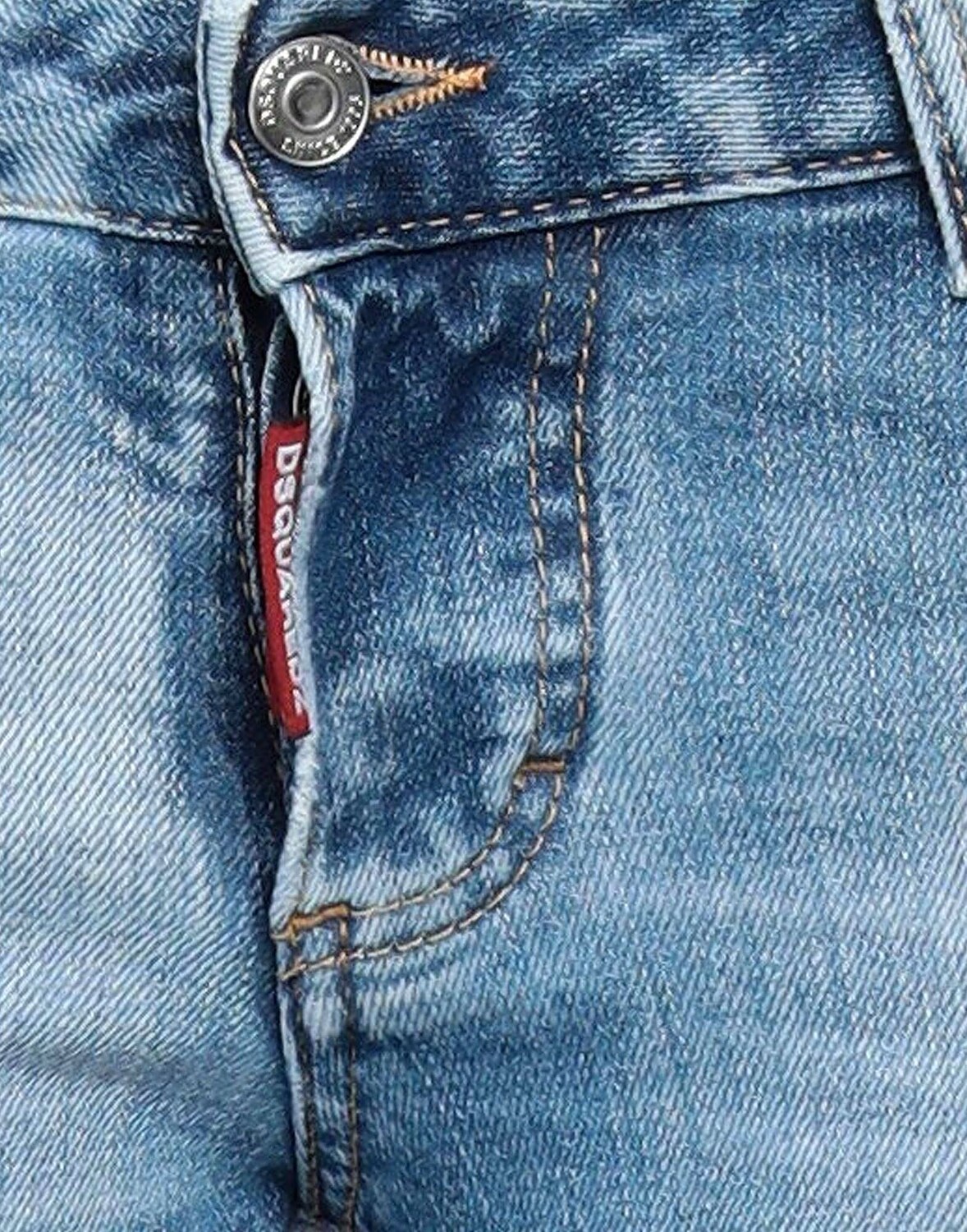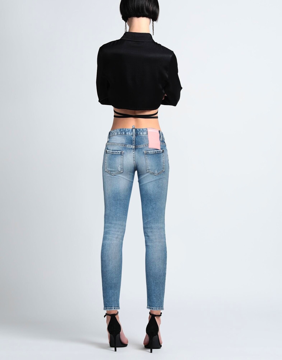 Деним, потертый, выцветший, логотип бренда, одноцветное изделие, светлая потертость, заниженная талия, застежка на пуговицах, пять карманов, модель скинни