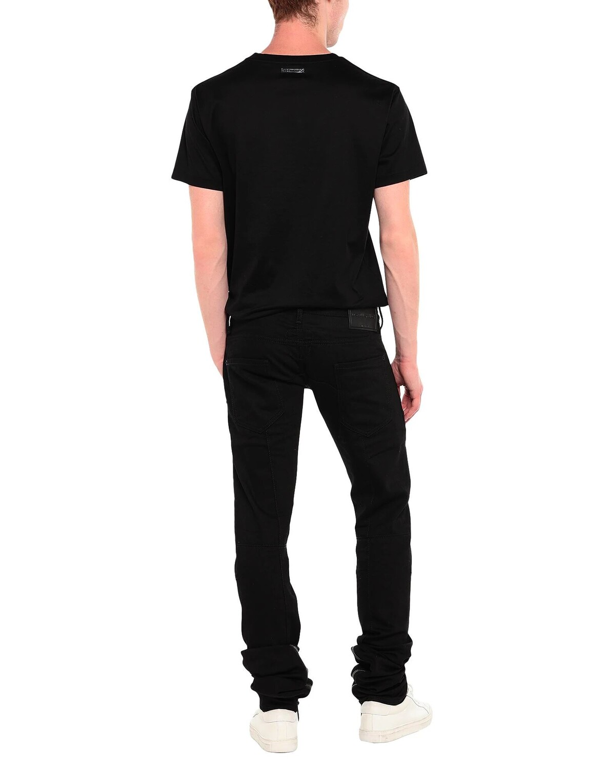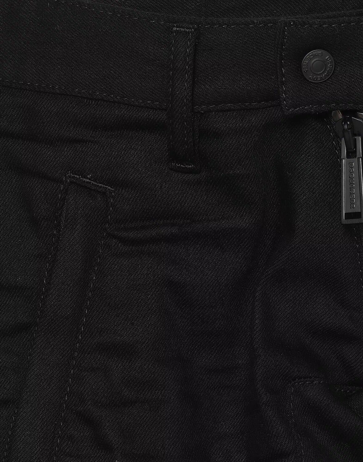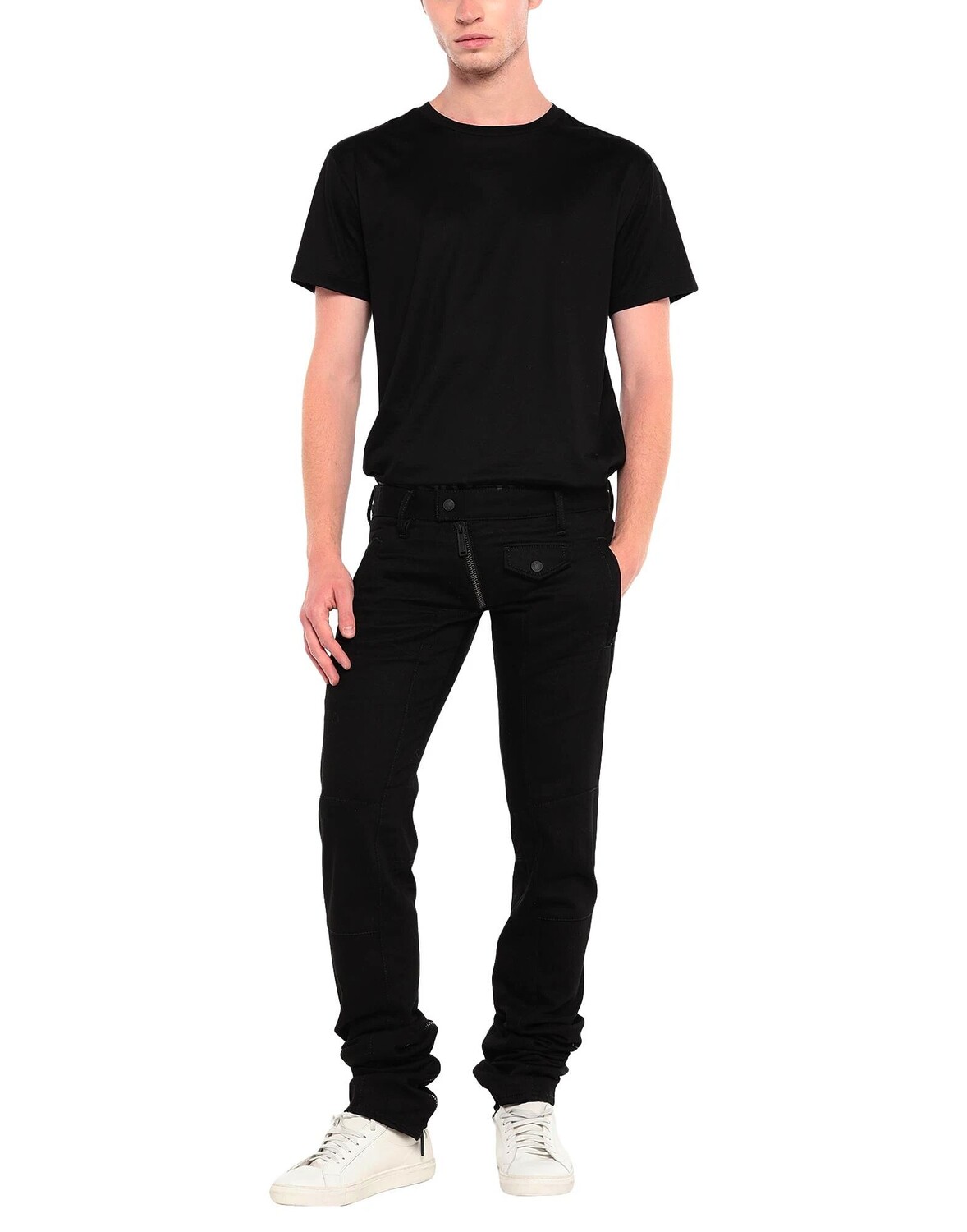 Джинсовая ткань, кожаные аппликации, логотип бренда, одноцветное изделие, цветная стирка, заниженная талия, застежка спереди, застежка-молния, пять карманов, молнии по низу, стрейч, содержит нетекстильные части животного происхождения