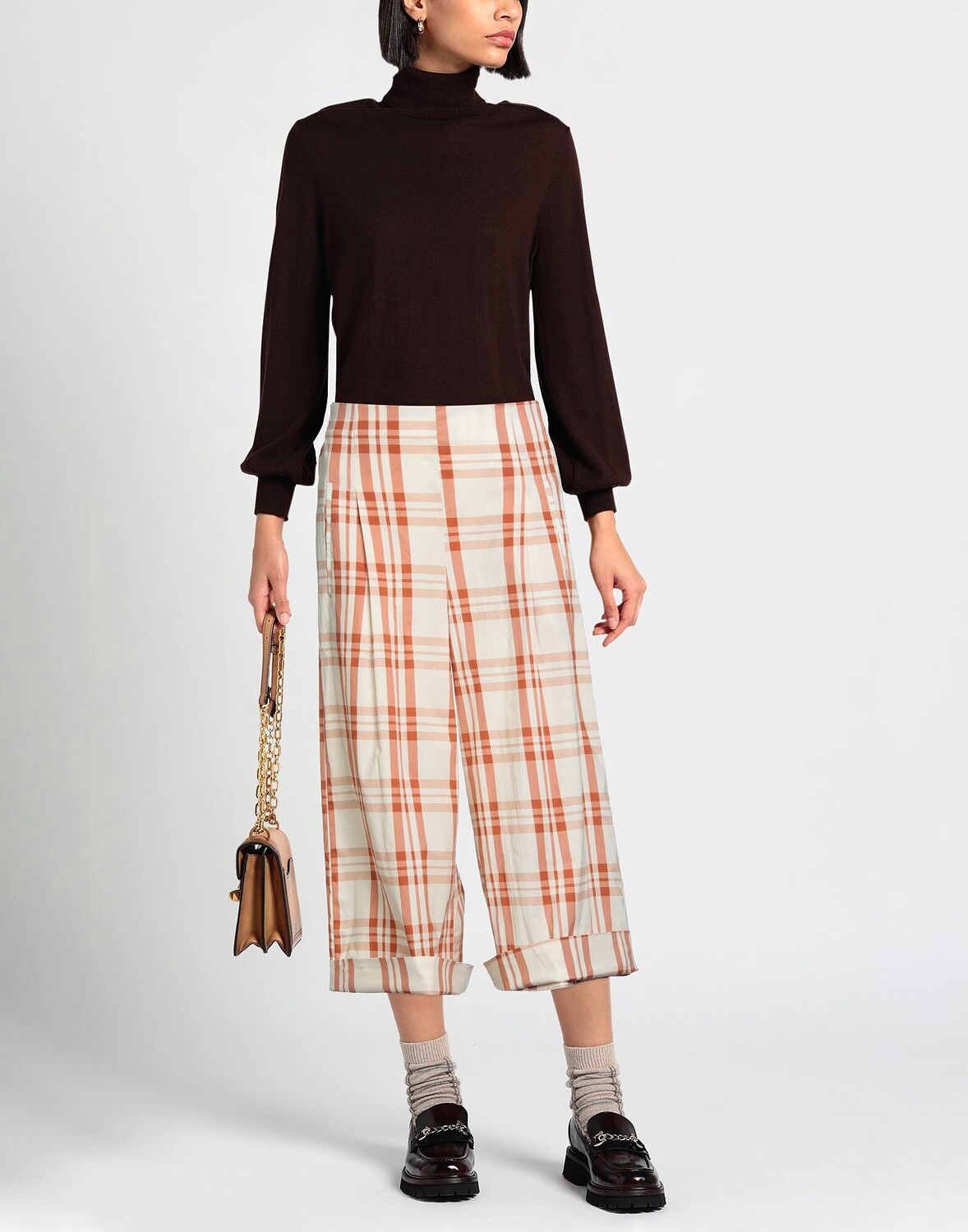 Полотняное переплетение, вытачки, узор в клетку «тартан», двухцветное изображение, завышенная талия, резинка на талии, широкие брючины, удобная посадка, манжеты по краям, множество карманов, стрейч