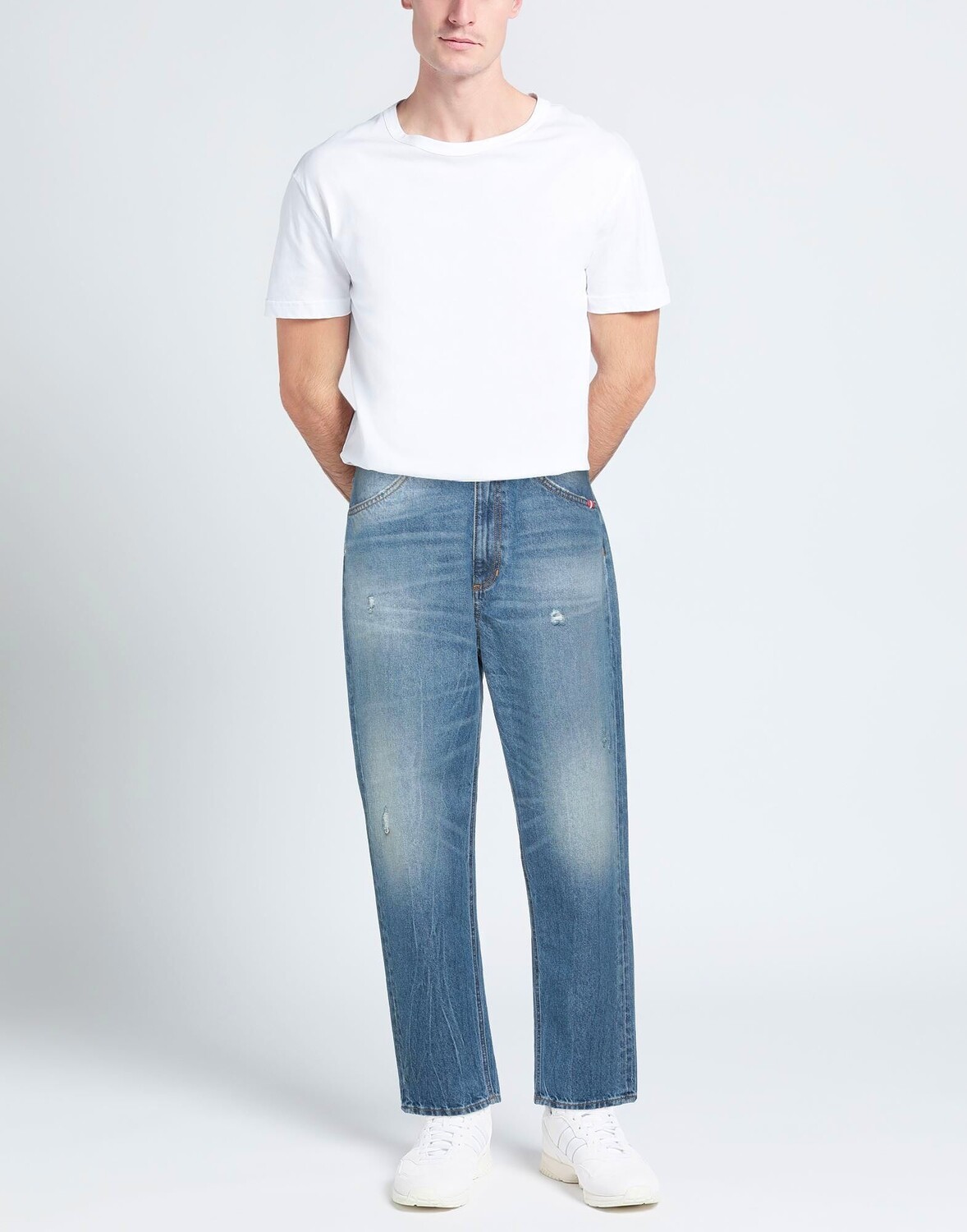 Деним, выцветший, эффект поношенности, логотип бренда, одноцветное изделие, средняя степень стирки, завышенная талия, застежка-молния, множество карманов, модель прямого кроя