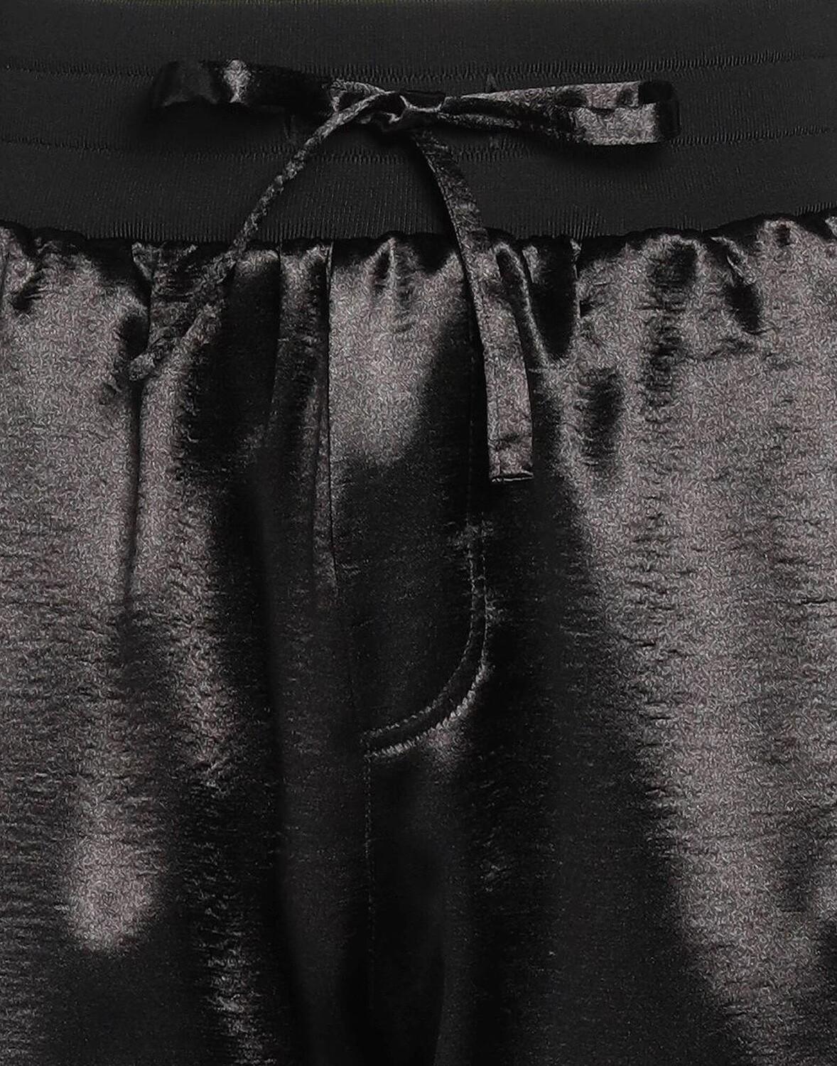 Атлас, логотип бренда, одноцветное изделие, высокая талия, свободный крой, застежка на шнурок, множество карманов, машинная стирка или химчистка, нельзя отбеливать, нельзя сушить в стиральной машине, зауженные брюки
