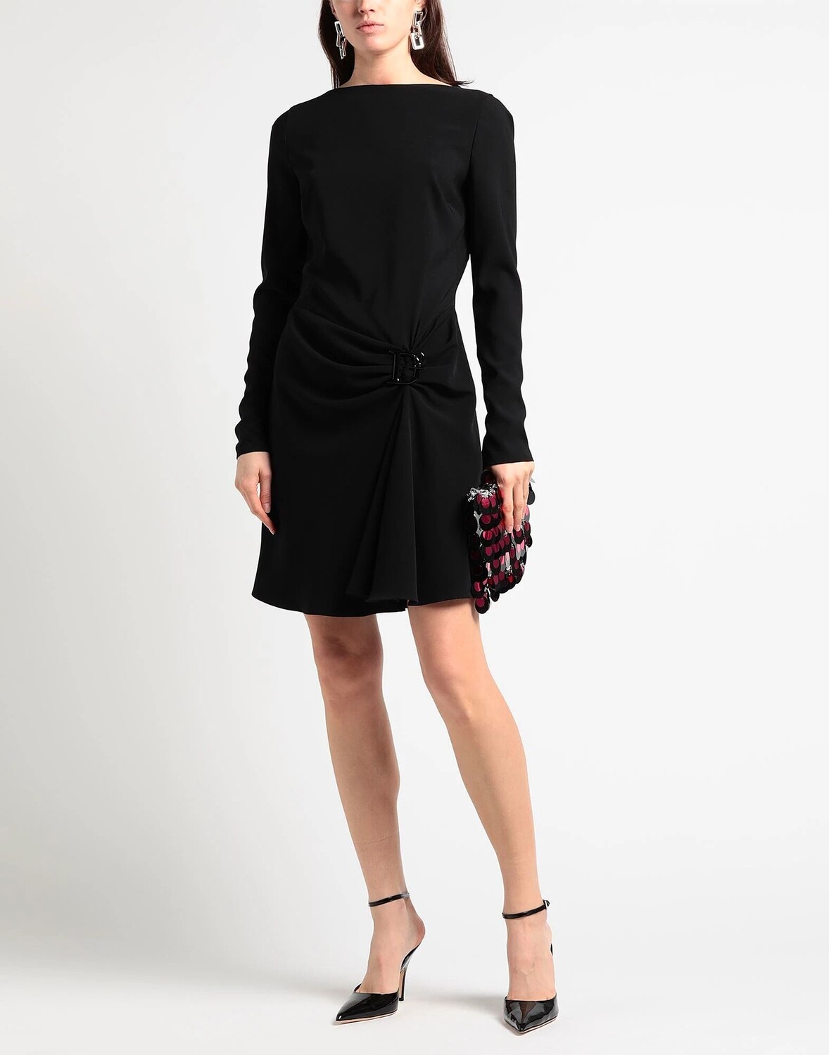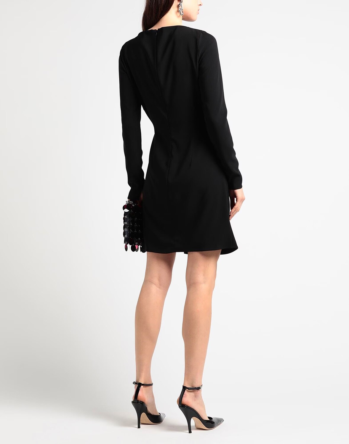 Креп, логотип бренда, одноцветное изделие, круглый вырез горловины, длинные рукава, внутри на подкладке, застежка-молния, застежки на крючки, без карманов, стрейч, химчистка, не отбеливать, не сушить в стиральной машине, облегающее платье, маломерность этого бренда