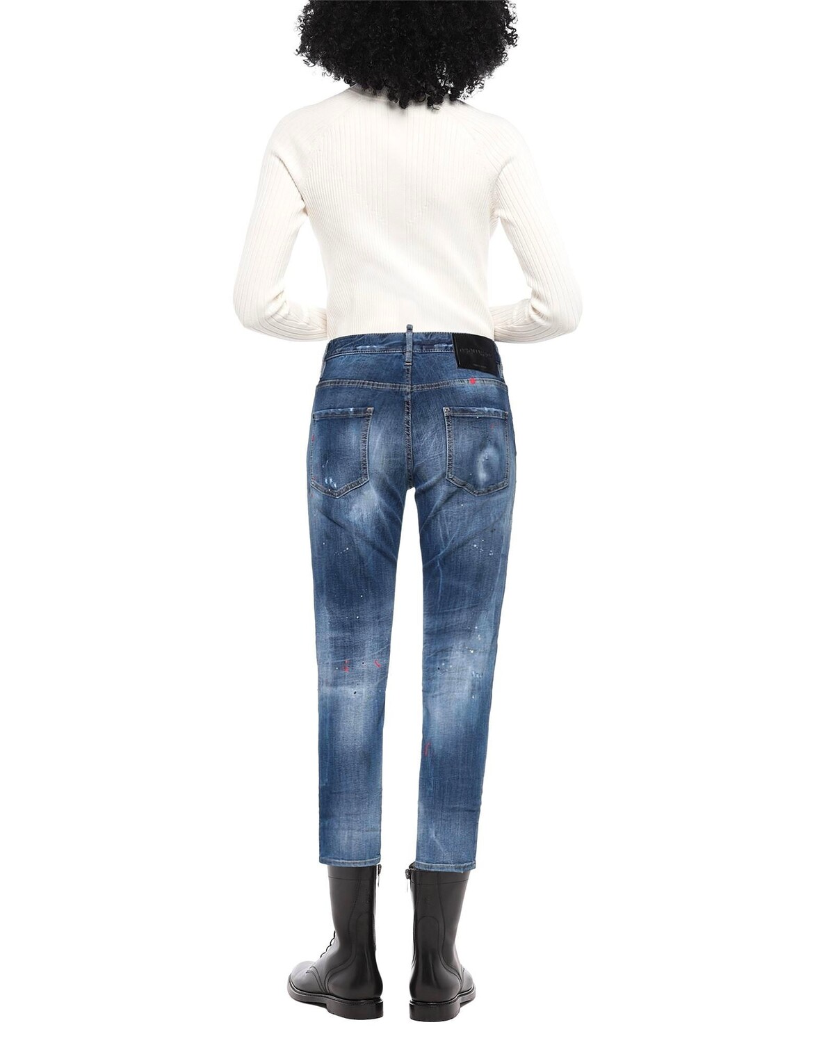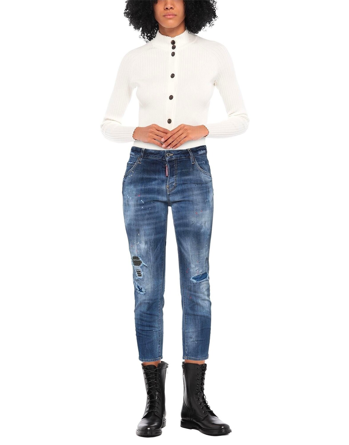 Кожа, деним, выцветший, эффект пятен, рваная ткань, заклепки, логотип бренда, разноцветный рисунок, средняя стирка, средняя посадка, шлевки для ремня, зауженная брючина, стандартный крой, пуговицы, пять карманов, стрейч, содержит нетекстильные части животного происхождения источник