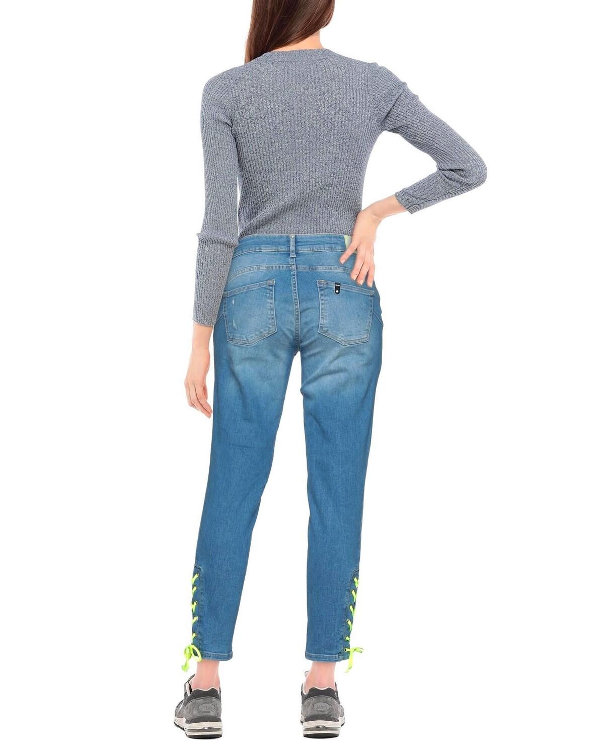 Деним, выцветший, эффект потертости, шнуровка, логотип бренда, одноцветное изделие с аппликациями, средняя посадка, шлевки для ремня, классический крой, зауженная брючина, застежка-молния, 1 пуговица, пять карманов, стрейч, средняя стирка