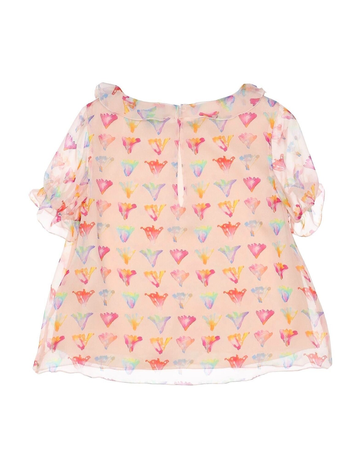 Шифон, без аппликаций, цветочный принт, круглый вырез, короткие рукава, без карманов, не стирать, химическая чистка, нельзя отбеливать, нельзя сушить в стиральной машине, гладить при температуре не выше 110°C, маленький размер