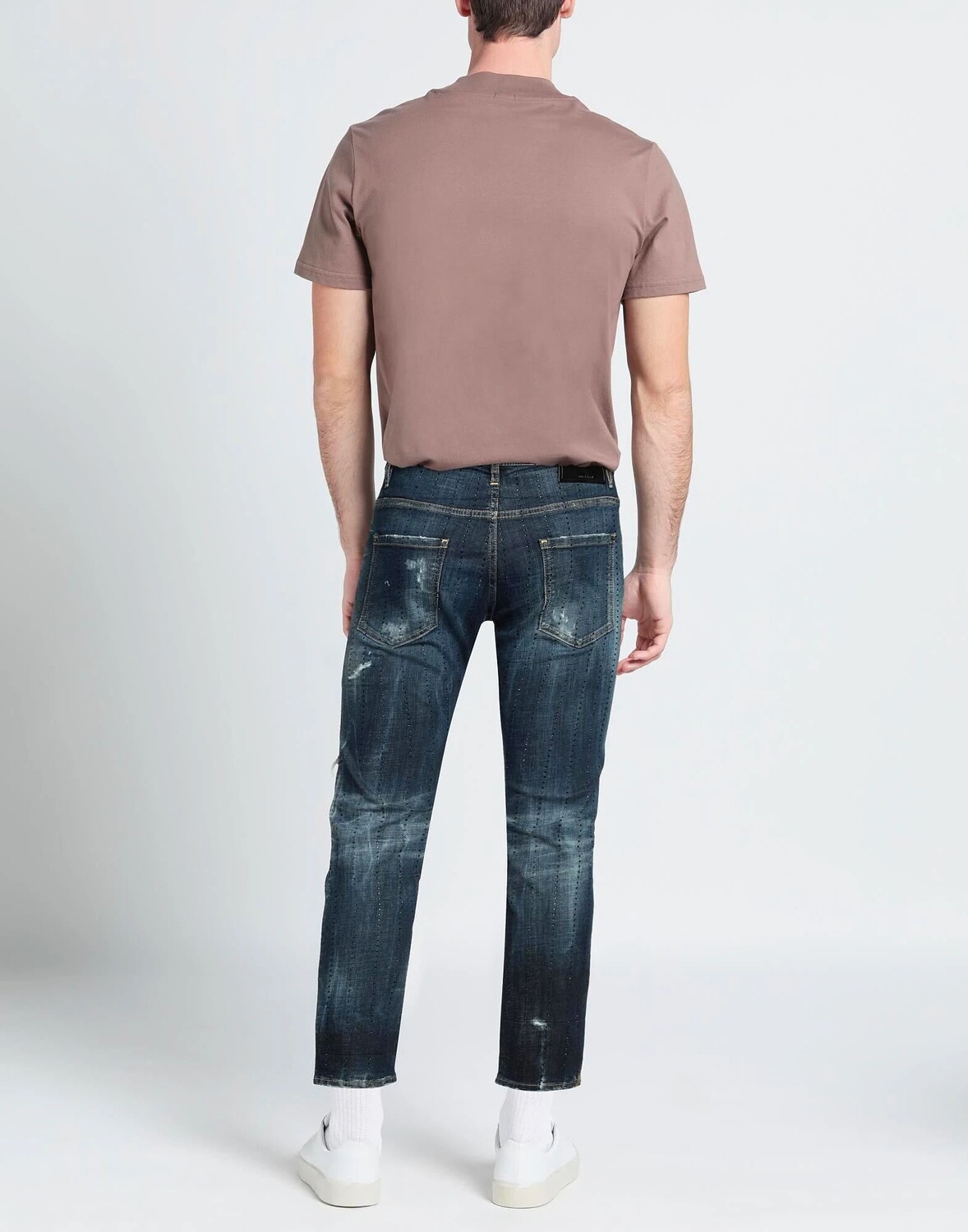 Деним, потертости, стразы, кожаная отделка, одноцветное изделие, средняя потертость, средняя посадка, зауженная брючина, застежка на пуговицы, множество карманов, содержит нетекстильные части животного происхождения, зауженная модель