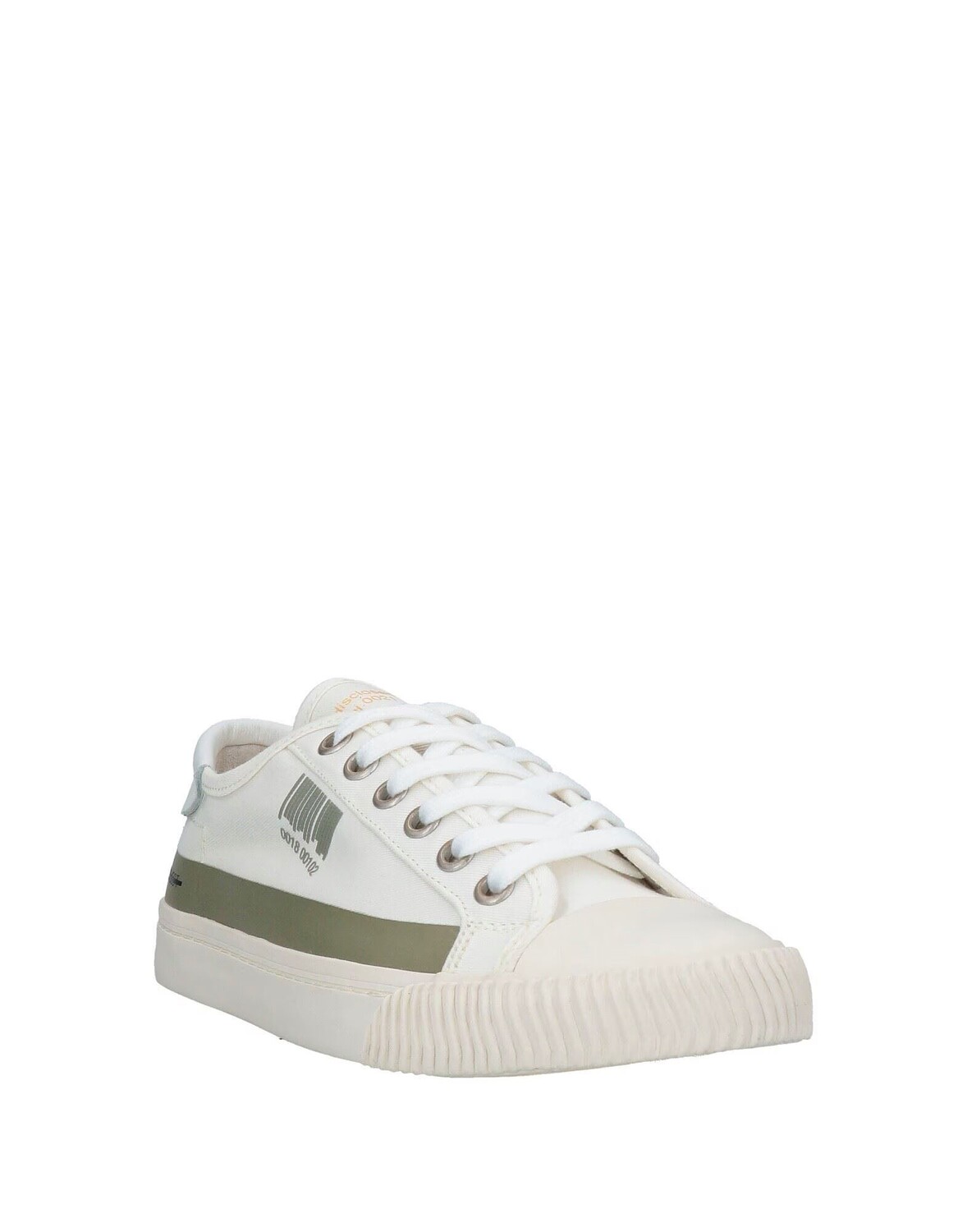 Полотняное переплетение, кожа, логотип бренда, двухцветное изображение, кожаная подкладка, шнуровка, скругленный носок, без каблука, резиновая подошва с тиснением, содержит нетекстильные части животного происхождения, низкие кеды и кроссовки
