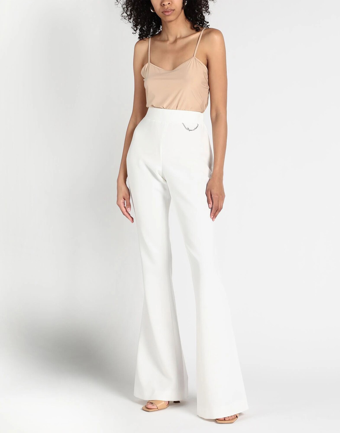 Брюки-клеш, креп, логотип бренда, декорирование, однотонное изделие с аппликациями, завышенная талия, приталенный крой, застежка-молния, без карманов, нельзя стирать, не отбеливать, нельзя сушить в стиральной машине