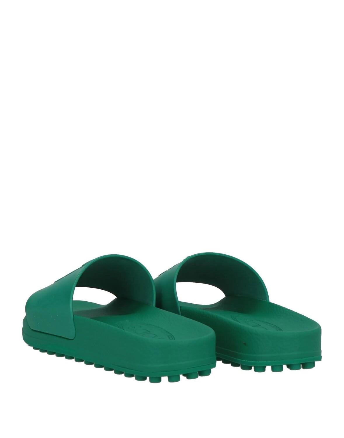 Логотип бренда, одноцветное изделие, резиновая подкладка, скругленный носок, плоская подошва, галька, шлепанцы для бассейна