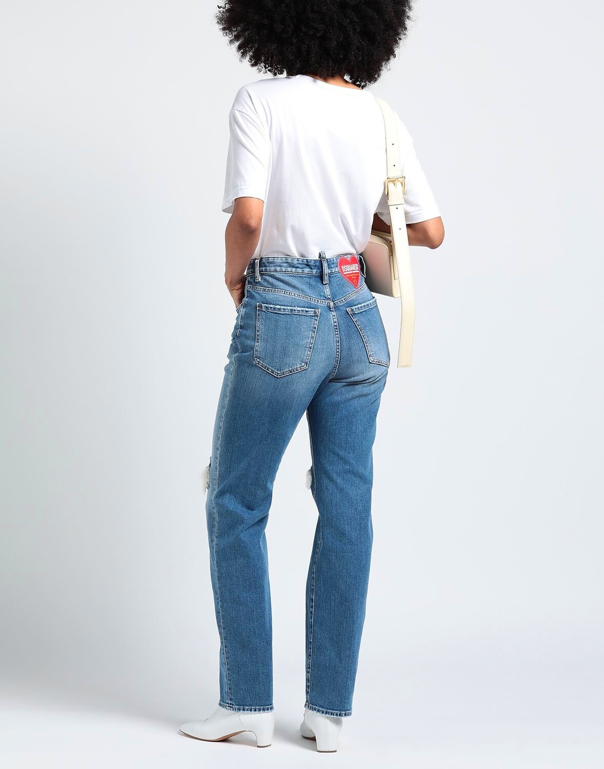 Деним, эффект потертости, рваная ткань, логотип бренда, одноцветное изделие, средняя стирка, завышенная талия, шлевки для ремня, зауженная брючина, стандартный крой, пуговицы, пять карманов, модель мамического кроя