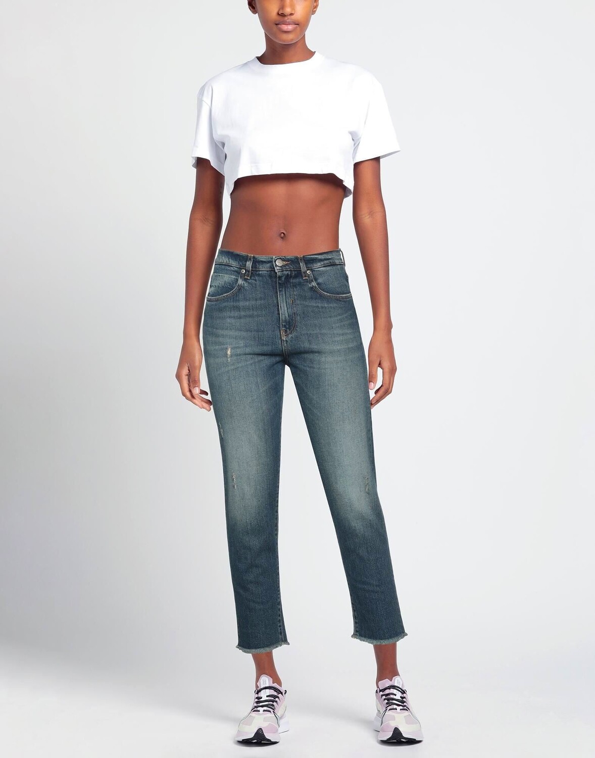 Деним, рваная ткань, логотип бренда, одноцветное изделие, темная стирка, завышенная талия, шлевки для ремня, зауженные брючины, стандартный крой, застежка-молния, 1 пуговица, бахрома по низу, пять карманов, модель мамического покроя