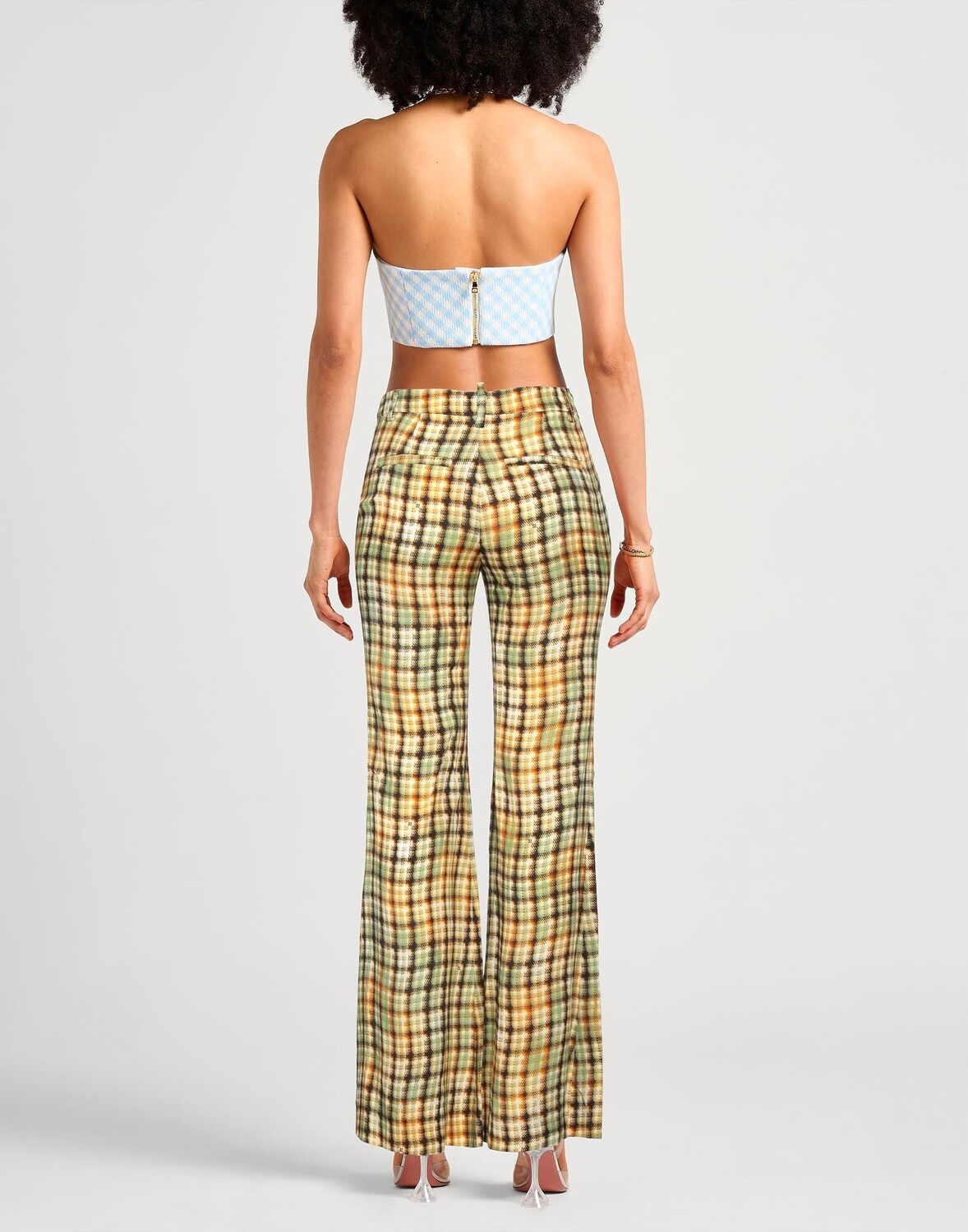 Полотняное переплетение, логотип бренда, клетка в клетку, завышенная талия, шлевки для ремня, расклешенный крой, классический крой, застежка-молния, застежка на крючки, множество карманов, содержит нетекстильные части животного происхождения, брюки чинос