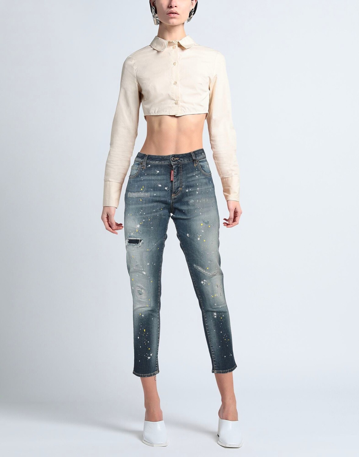 Деним, эффект пятен, рваная ткань, стразы, логотип бренда, одноцветное изделие, средняя стирка, средняя посадка, зауженные брючины, узкие брюки, застежка-молния, 1 пуговица, пять карманов, стрейч, модель скинни