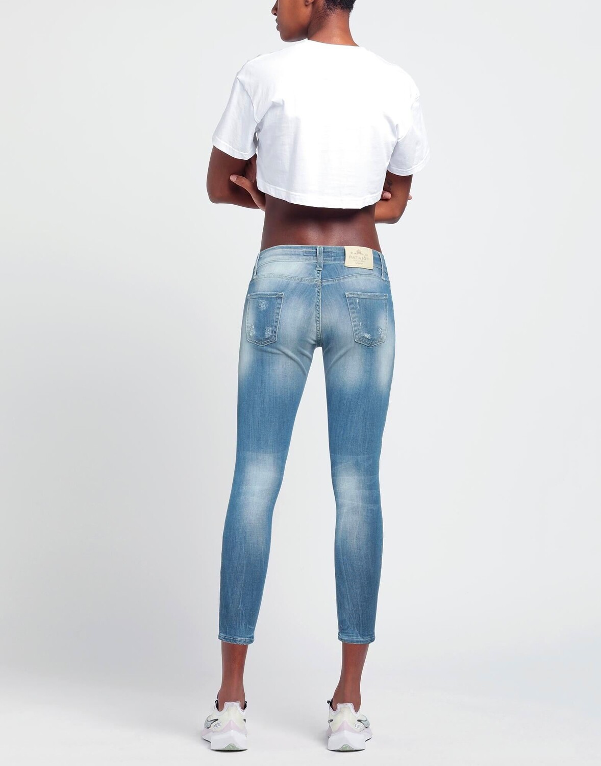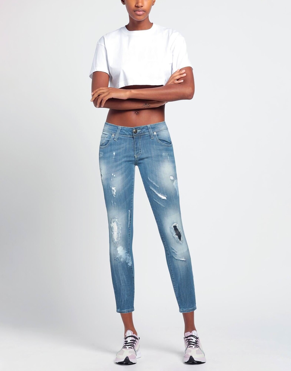 Деним, выцветшая, рваная ткань, логотип бренда, одноцветное изделие, темная стирка, заниженная талия, зауженные брючины, стандартный крой, застежка-молния, 1 пуговица, множество карманов, стрейч, модель скинни