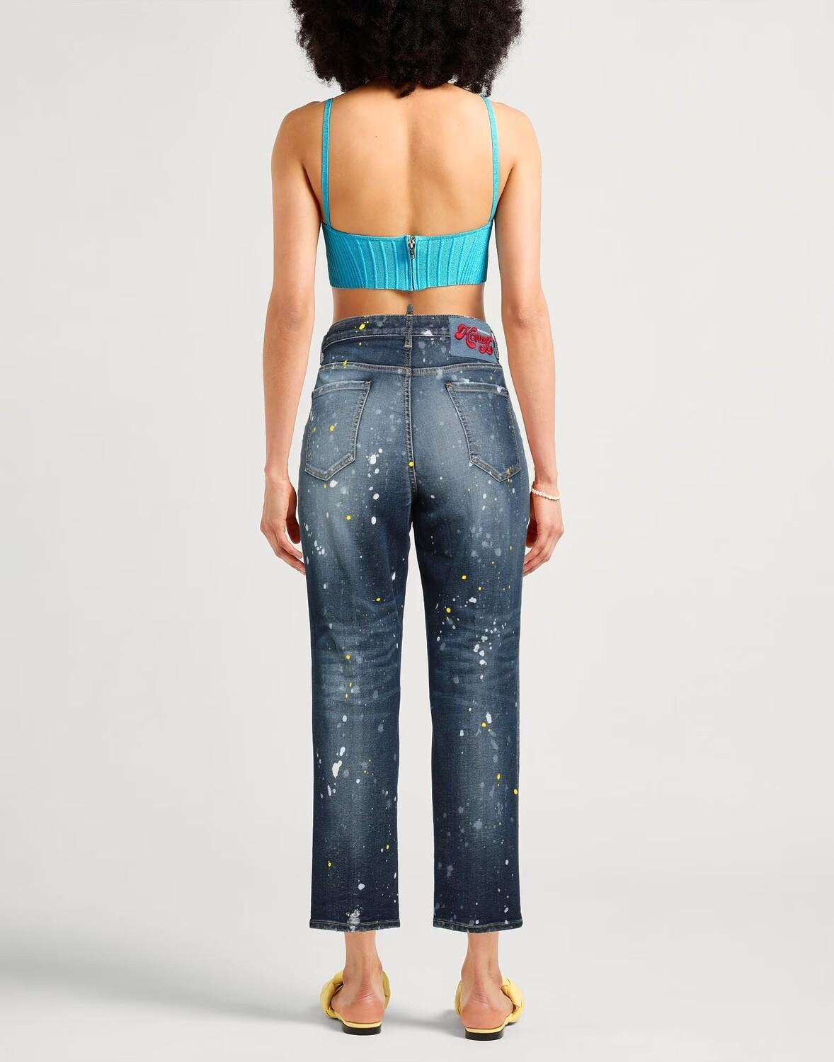 Деним, выцветший, кристаллы, логотип бренда, одноцветное изделие с аппликациями, средняя стирка, высокая талия, шлевки для ремня, стандартный крой, застежка-молния, множество карманов, эластичный, не подвергать химчистке, не отбеливать, сушить в стиральной машине, не гладить, прямой джинсы с ногами