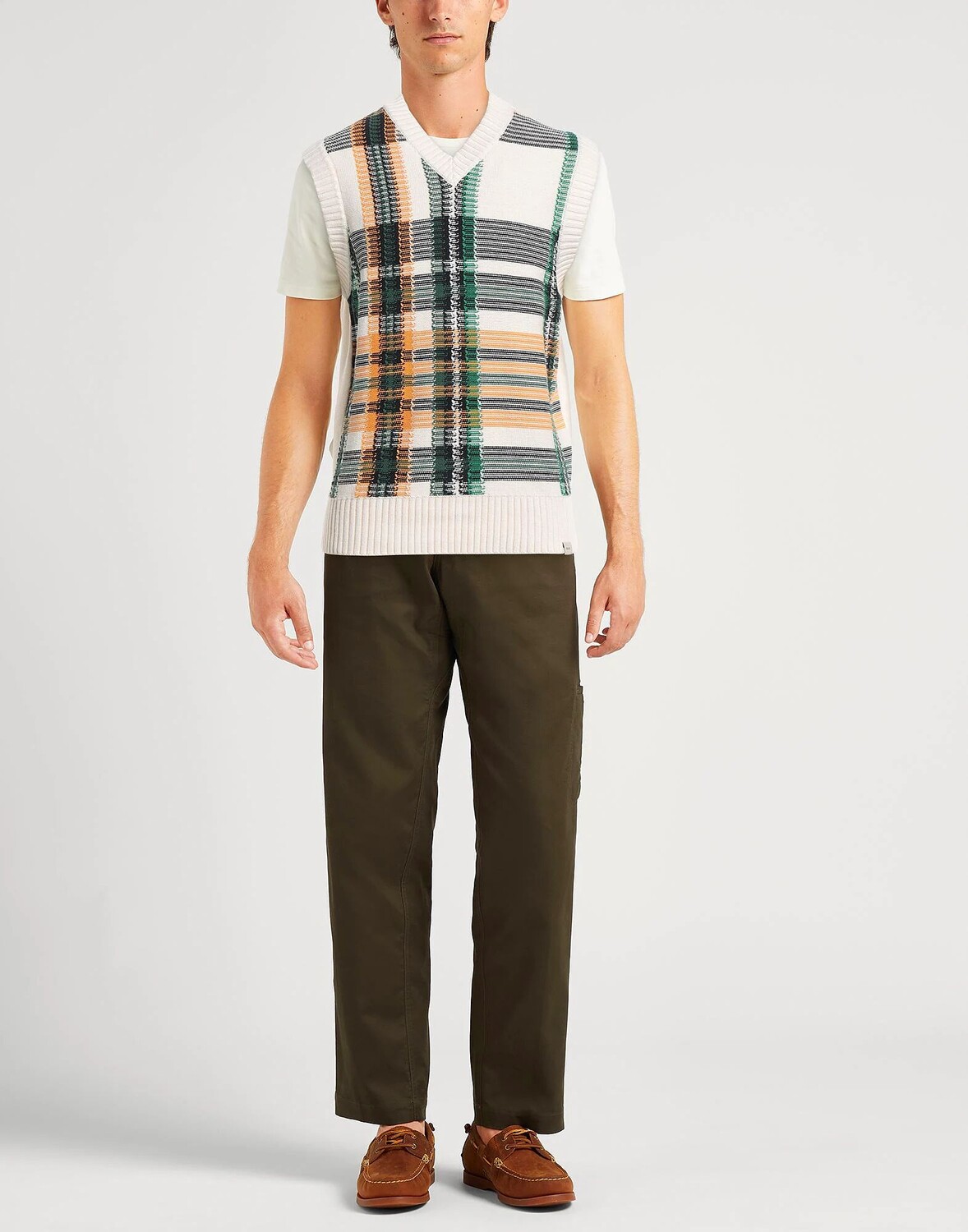 Трикотаж, трикотаж средней плотности, логотип бренда, узор в клетку «тартан», v-образный вырез, без рукавов, без карманов, ручная стирка или химчистка, нельзя отбеливать, нельзя сушить в стиральной машине
