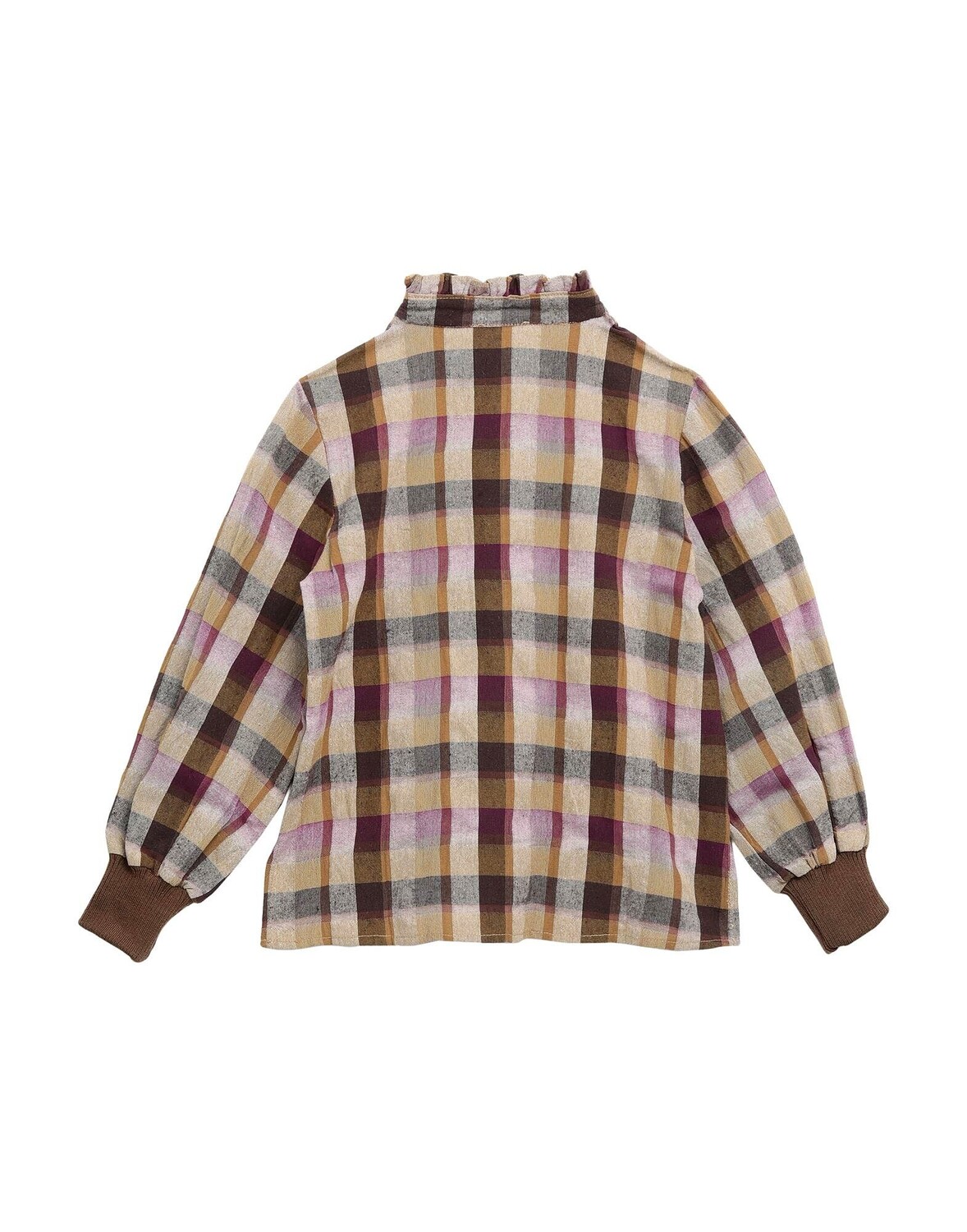 Полотняное переплетение, оборки, узор в клетку «тартан», воротник-стойка, длинные рукава, ребристые манжеты, застежка на пуговицы, боковой разрез по низу, стирка при 30°C, химическая чистка, не отбеливать, можно сушить в стиральной машине, гладить при температуре не выше 110°C