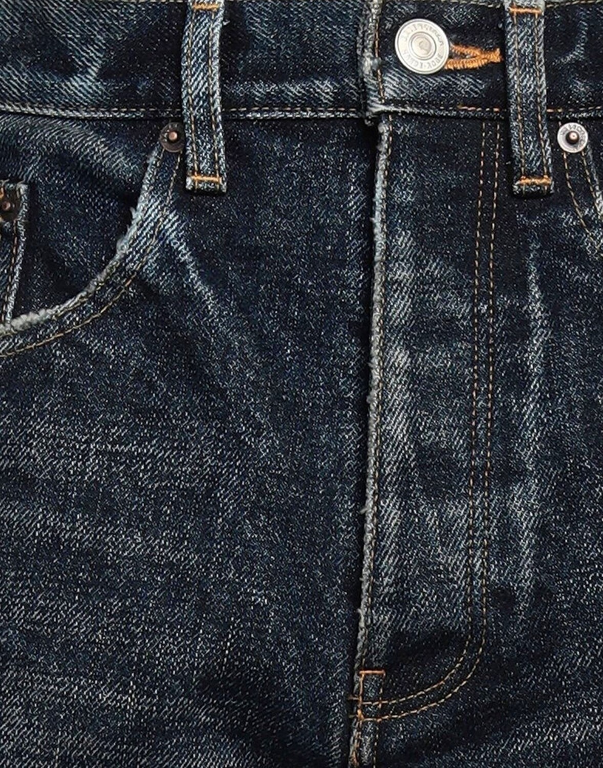 Деним, выцветший, эффект поношенности, логотип бренда, одноцветное изделие, темная стирка, завышенная талия, шлевки для ремня, прямые брючины, стандартный крой, застежка-молния, пять карманов, модель прямого кроя