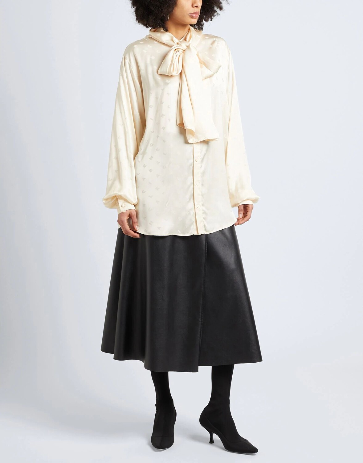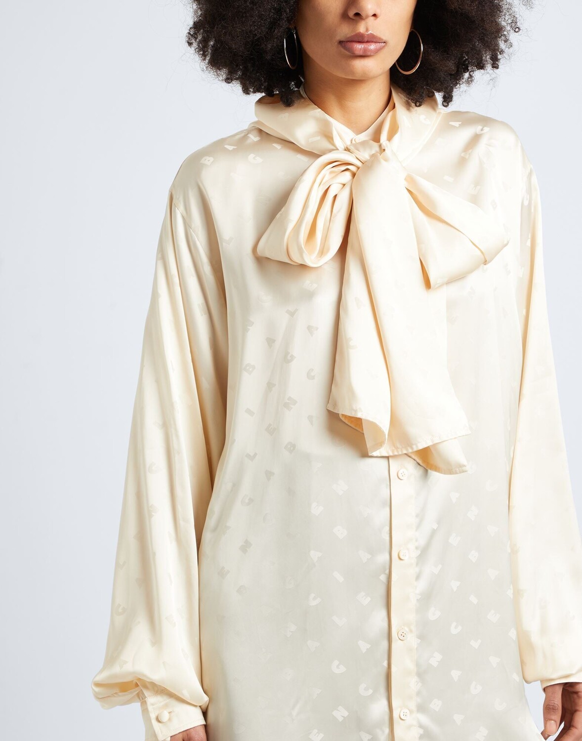 Сатин, без аппликаций, логотип-принт, воротник-стойка, длинные рукава, застежка на пуговицы, без карманов, содержит нетекстильные части животного происхождения, химчистка, нельзя сушить в стиральной машине, не отбеливать, рубашка оверсайз