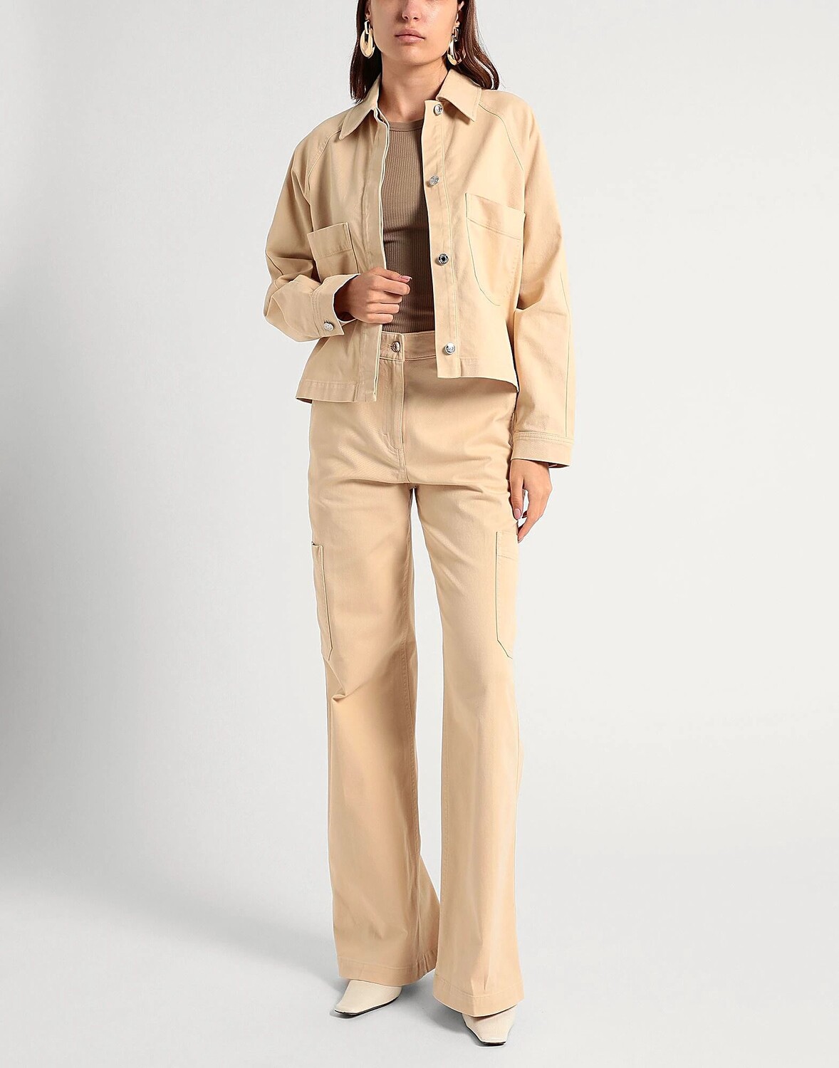 Габардин, логотип бренда, кожаная отделка, одноцветное изделие с аппликациями, высокая талия, шлевки для ремня, стандартный крой, 1 пуговица, застежка-молния, множество карманов, стрейч, машинная стирка, нельзя отбеливать, нельзя сушить в стиральной машине, содержит нетекстильные части животного происхождения, брюки-карго