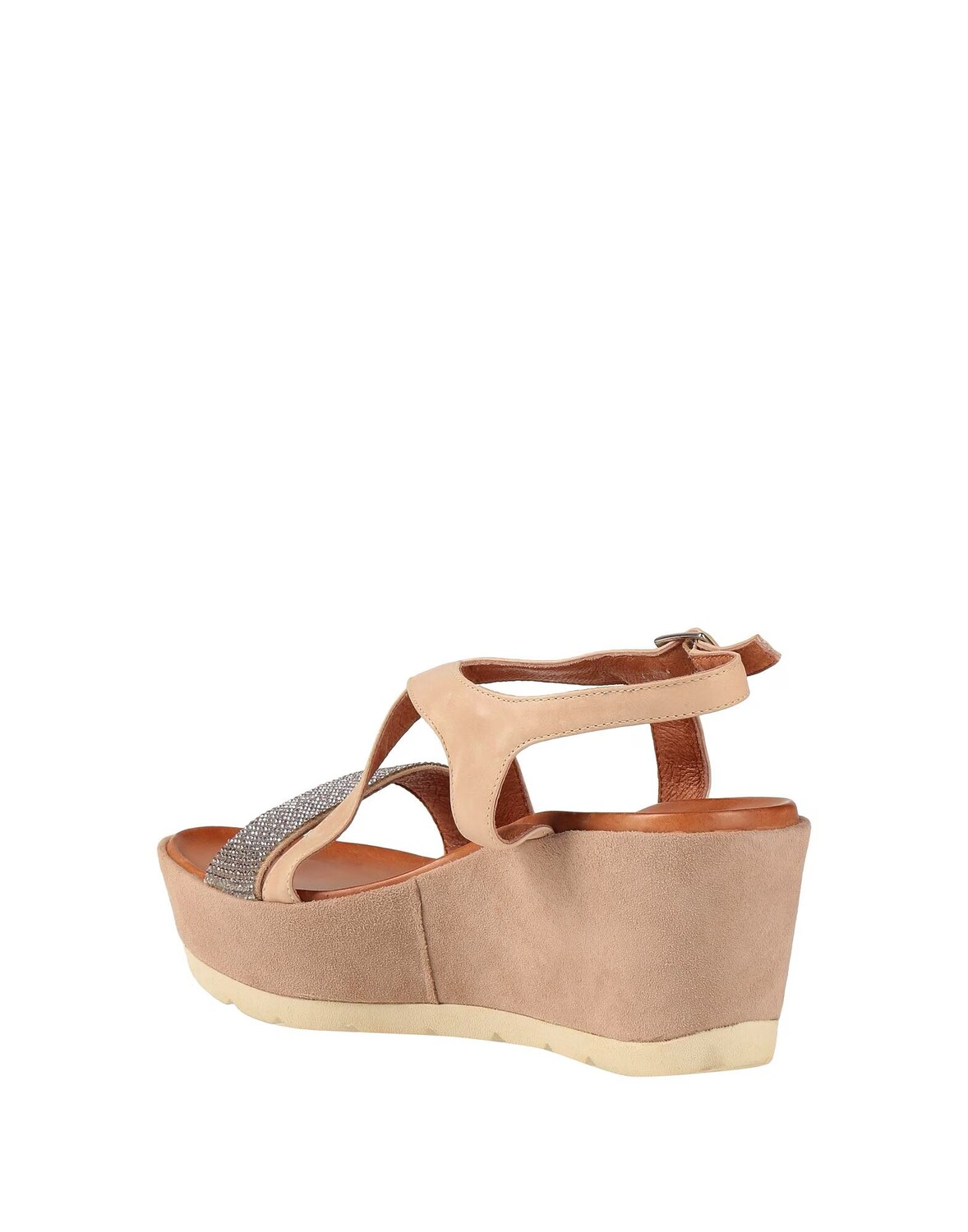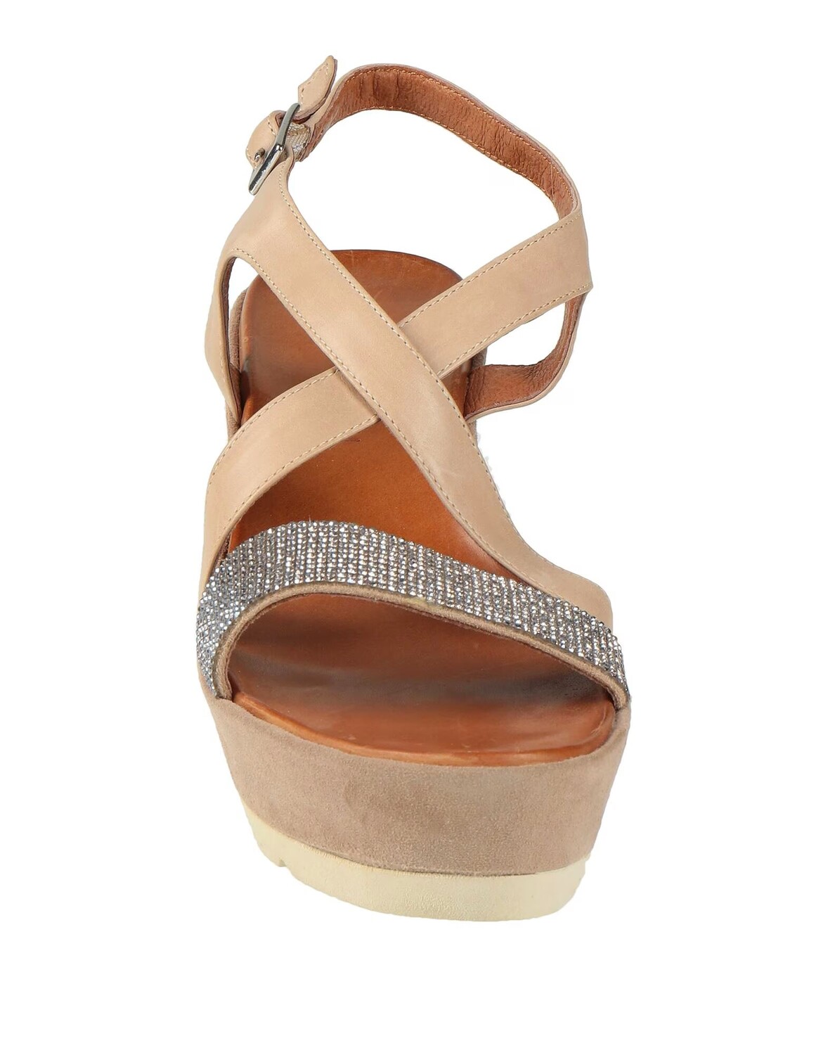 Кожа, кристаллы, одноцветное изделие с аппликациями, застежка на пряжке, круглый носок, танкетка, резиновая подошва с тиснением, содержит нетекстильные части животного происхождения, босоножки с ремешком на щиколотке