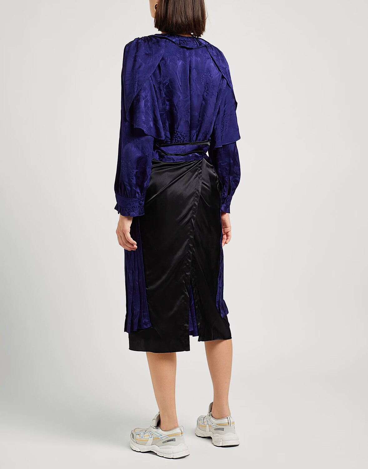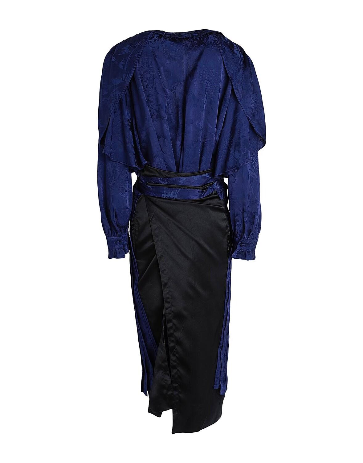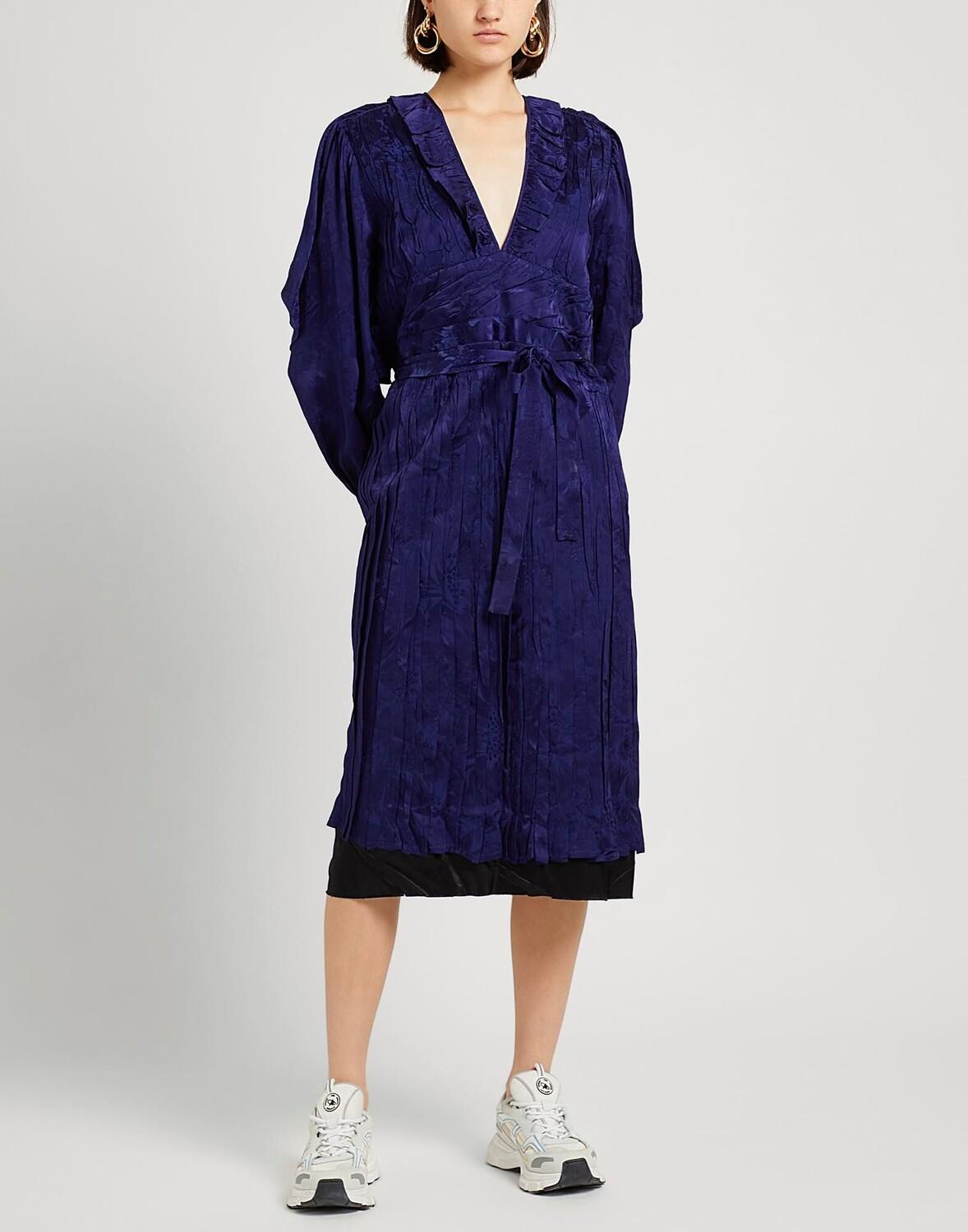 Плиссированное платье, жаккард, атлас, одноцветное изделие, оборки, плиссировка, v-образный вырез, длинные рукава, частичная подкладка, химчистка, нельзя отбеливать, нельзя сушить в стиральной машине