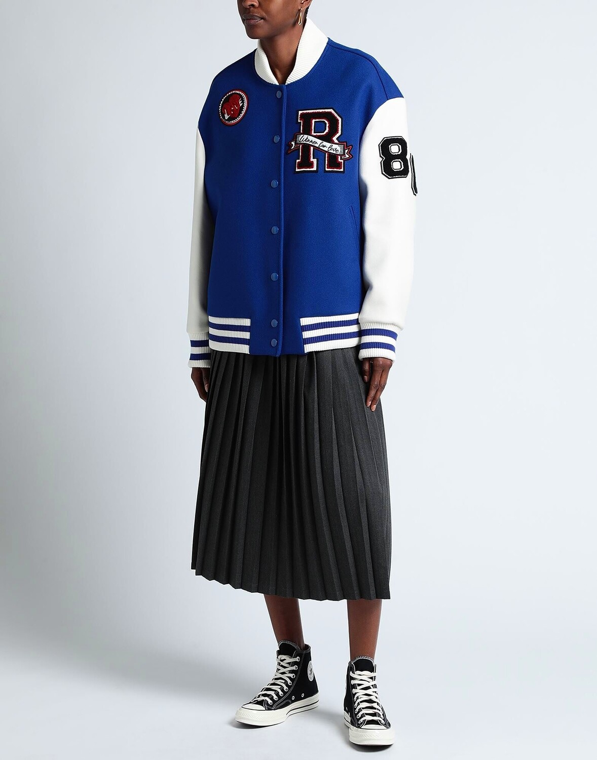 Фетр, трикотаж, легкий трикотаж, логотип бренда, стразы, разноцветный, круглый вырез, однобортный, длинные рукава, без подкладки, кнопки, множество карманов, химчистка, нельзя отбеливать, нельзя сушить в стиральной машине, университетская куртка