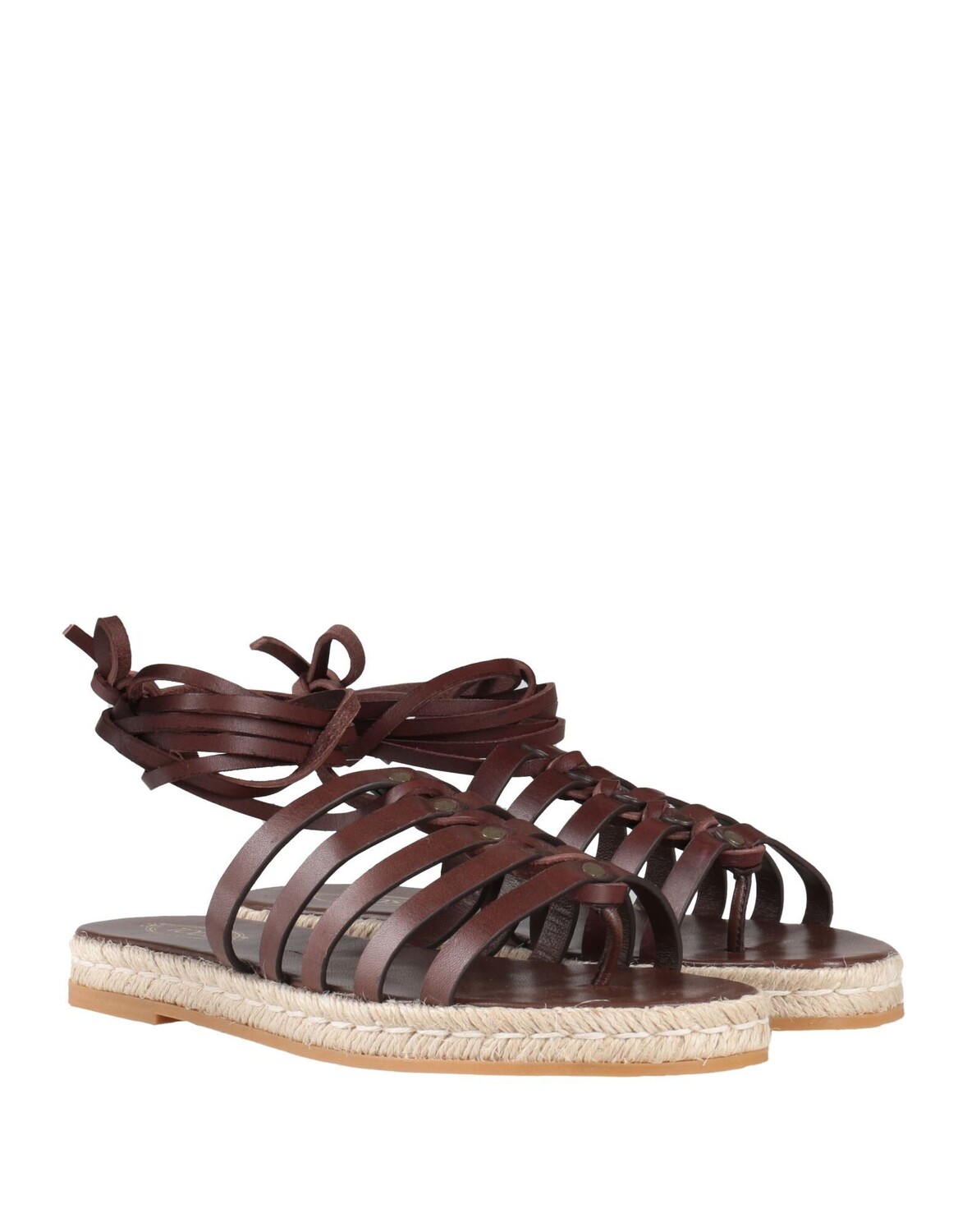 Кожа, без аппликаций, одноцветное изделие, кожаная подкладка, застежка на ремни, скругленный носок, плоская, резиновая подошва с тиснением, содержит нетекстильные части животного происхождения, сандалии-эспадрилья