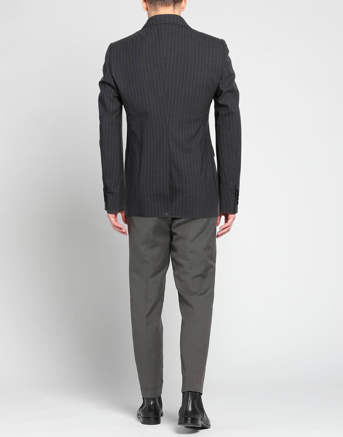 Холодная шерсть, без аппликаций, в тонкую полоску, воротник с лацканами, однобортный, длинные рукава, манжеты с прорезями, внутри на подкладке, пуговицы, множество карманов, разрез сзади, однобортный пиджак